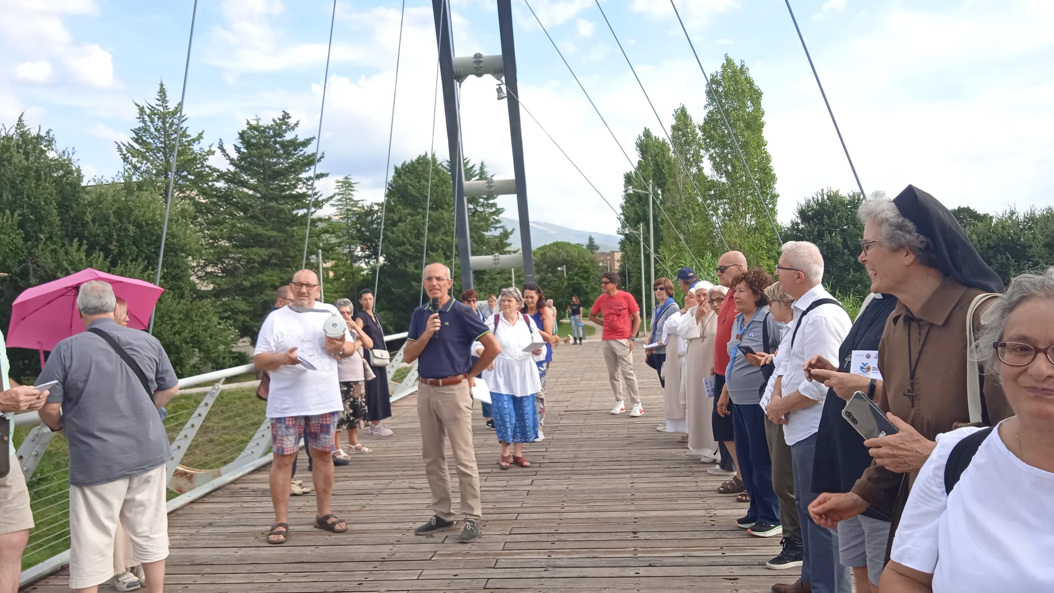 I fedeli sono stati accolti da don Gianni Nizzi nella parrocchia di Santa Angela che ha ricordato come il territorio di Foligno e di Assisi, ora unito storicamente sotto la guida pastorale del vescovo Sorrentino, siano da sempre legati geograficamente dai fiumi Topino e Chiascio.