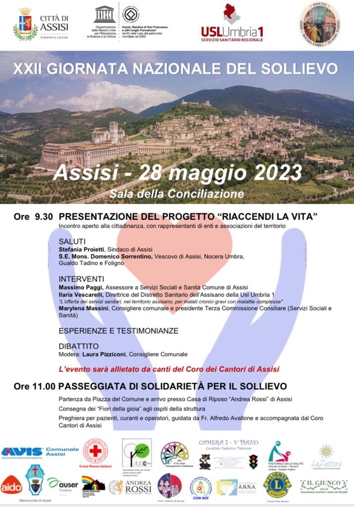 Come da programma alle ore 9,30 nella sala della Conciliazione del Comune di Assisi ci sarà la presentazione del progetto “Riaccendi la vita”. L’incontro aperto a tutta la cittadinanza vedrà la presenza di rappresentanti di enti e associazioni del territorio. Dopo i saluti del sindaco di Assisi, Stefania Proietti, del vescovo delle diocesi di Assisi – Nocera Umbra – Gualdo Tadino e di Foligno, monsignor Domenico Sorrentino seguiranno gli interventi di Massimo Paggi, assessore a servizi sociali e sanità del Comune di Assisi, Ilaria Vescarelli, direttrice del distretto sanitario dell’assisano dell’Usl Umbria 1 sul tema “L’offerta dei servizi sanitari, nel territorio assisano, per malati cronici gravi con malattie complesse”, Marylena Massini, consigliere comunale e presidente Terza commissione consiliare (Servizi sociali e sanità). Seguirà un momento di riflessione durante il quale verranno raccontate esperienze e testimonianze. Il dibattito sarà moderato da Laura Pizziconi, consigliere comunale. L’evento sarà allietato dal Coro dei Cantori di Assisi.