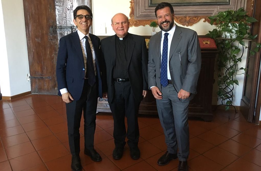 ASSISI – I nuovi vertici della società Tagina Ceramiche D’Arte Spa, lunedì 25 giugno, sono stati accolti nel Palazzo vescovile di Assisi, dal vescovo diocesano monsignor Domenico Sorrentino. È stata una visita di cortesia molto sentita, all’indomani della ripresa dell’attività produttiva dello stabilimento gualdese, che Francesco Borgomeo, presidente Saxa Gres e vicepresidente Tagina e Stefano Donati, presidente e amministratore delegato della Tagina Spa hanno riservato al vescovo Sorrentino da sempre attento alla difficile situazione che ha attraversato la società. Una visita che sarà ricambiata quando il vescovo si recherà, probabilmente dopo l’estate, a celebrare la messa all’interno della struttura. Si è infatti deciso di posticipare la celebrazione eucaristica fissata per venerdì 29 giugno ad un momento successivo. “Ho appreso con molto piacere – ha dichiarato il vescovo – l’impegno dei dirigenti dell’azienda per il rilancio di una fabbrica storica e di una eccellenza del territorio, sia dal punto di vista degli impianti che delle maestranze. Sono molto lieto di avere assistito a tale provvidenziale rinascita che permette il mantenimento di molti posti di lavoro e l’incremento dello sviluppo economico e sociale del territorio, già fortemente colpito dalla crisi della ex Merloni”.