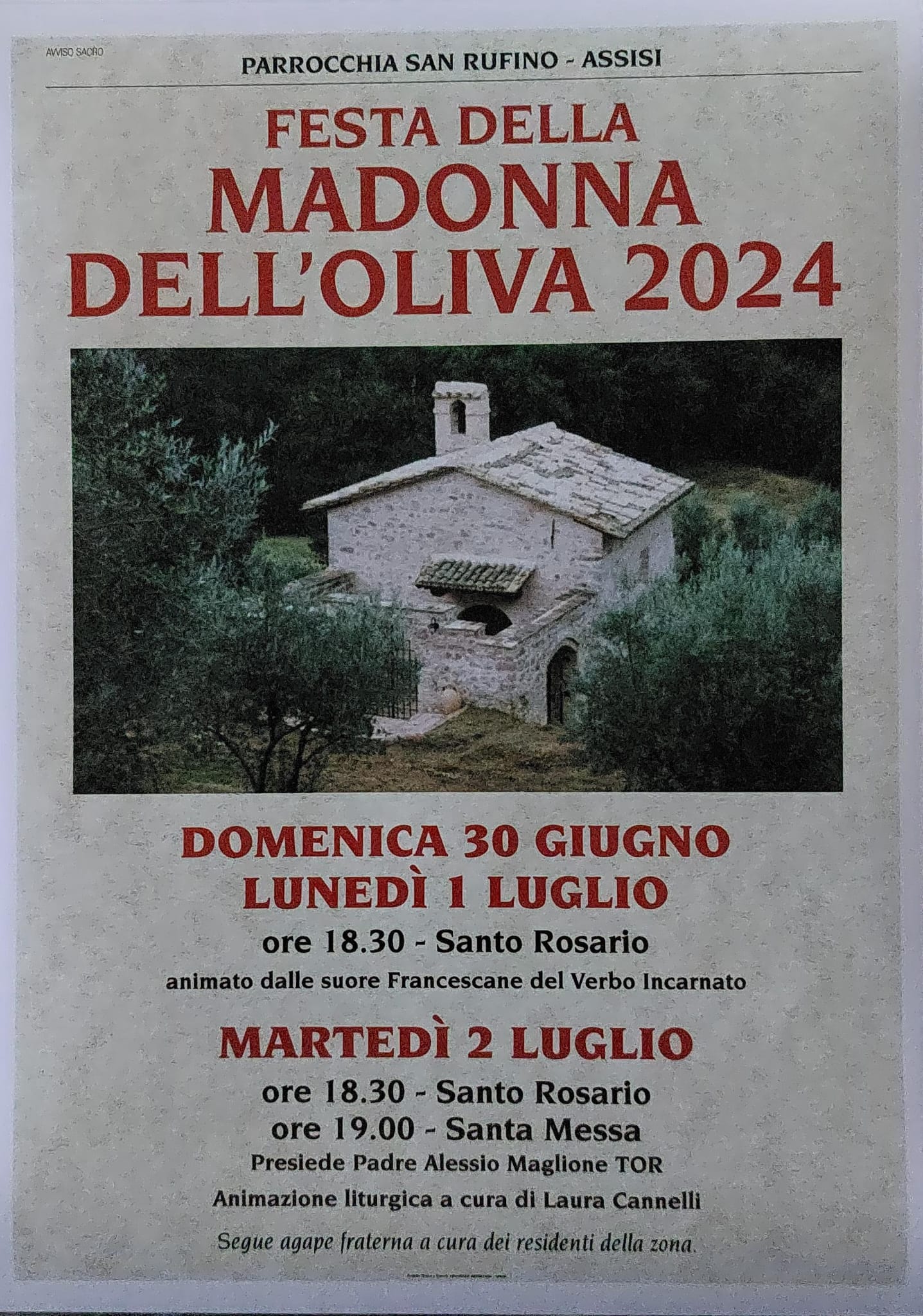 ASSISI – La Parrocchia di San Rufino di Assisi organizza la tradizionale Festa della Madonna dell’Oliva che ricorre il 2 luglio.