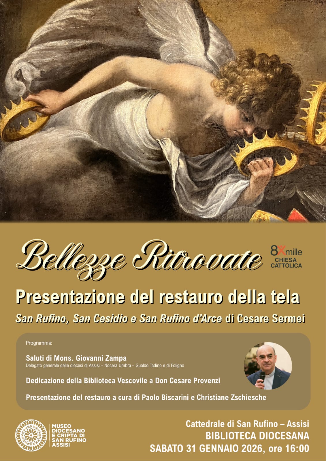 Alla cerimonia parteciperanno don Giovanni Zampa, delegato generale della diocesi di Assisi-Nocera Gualdo Tadino e Foligno, il parroco don Alessandro Picchiarelli e i familiari di don Cesare. L’appuntamento, a ingresso libero, rappresenta un’occasione preziosa per appassionati d’arte, studiosi e cittadini, chiamati a riscoprire una testimonianza fondamentale dell’identità culturale e religiosa di Assisi, all’interno di uno dei luoghi più simbolici della città.