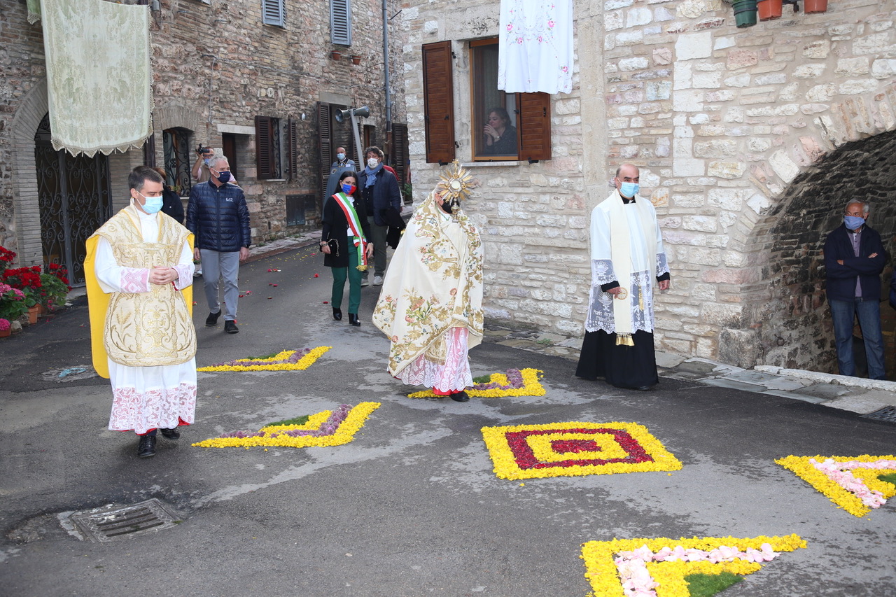 ASSISI - Anche quest'anno nella domenica della solennità del Corpus Domini, la suggestiva processione detta “delle pulci”, si è snodata, dopo la solenne celebrazione, per le vie della parte alta di Assisi, nel rispetto del distanziamento e delle misure anti coronavirus. Sempre colorate e ben definite sono state le immagini riprodotte sulla strada con i petali e con qualche piccolo accenno di infiorate. Molti sono stati i drappi e le tovaglie esposti sulle finestre e sui balconi, gli altari riccamente addobbati di fiori e candele allestiti per le vie attraversate dal corteo e i fedeli che si sono affacciati al passaggio del Santissimo senza dar luogo ad assembramenti per i vicoli.