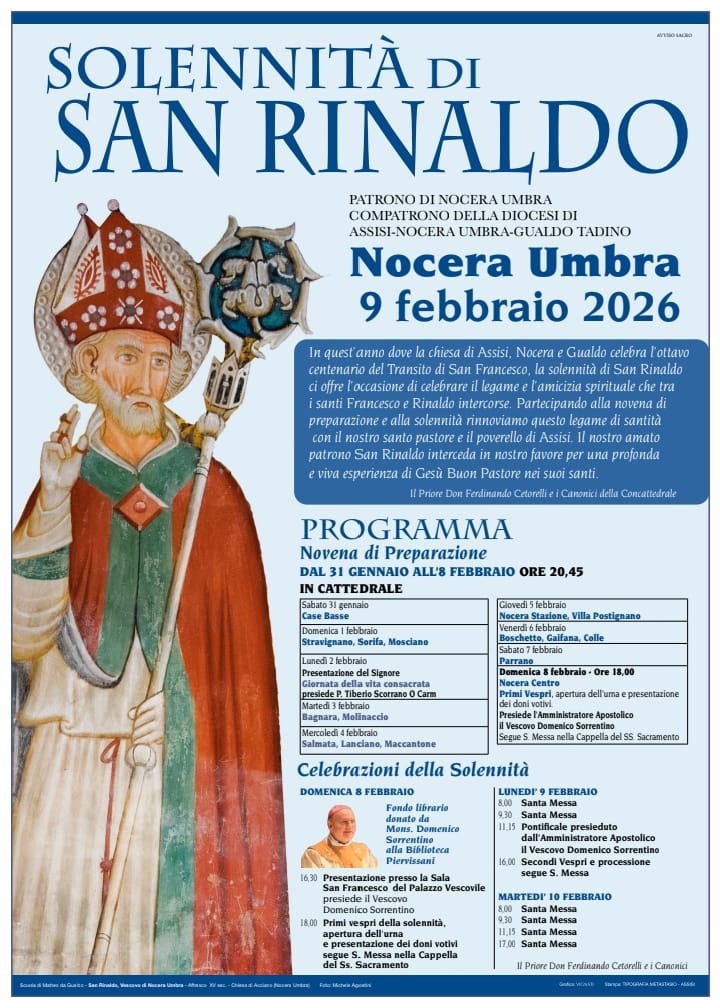 NOCERA UMBRA – “In questo anno di Grazia dove la chiesa di Assisi Nocera Umbra e Gualdo Tadino celebra l’ottavo centenario del transito di San Francesco la solennità di San Rinaldo ci offre l’occasione di celebrare il legame e l’amicizia spirituale che tra i santi Francesco e Rinaldo intercorse partecipando alla novena di preparazione alla solennità rinnoviamo questo legame di Santità con il nostro Santo pastore e Il poverello di Assisi il nostro amato patrono San Rinaldo interceda il nostro favore per una profonda e viva esperienza di Gesù Buon Pastore nei suoi Santi”. Lo dicono il priore, don Ferdinando Cetorelli e i canonici della Concattedrale, che invitano tutta la cittadinanza a partecipare a uno dei momenti più sentiti della vita religiosa e civile di Nocera e della Diocesi: la solennità di San Rinaldo, patrono della città e compatrono della Chiesa di Assisi-Nocera Umbra-Gualdo Tadino, che si festeggia lunedì 9 febbraio 2026.