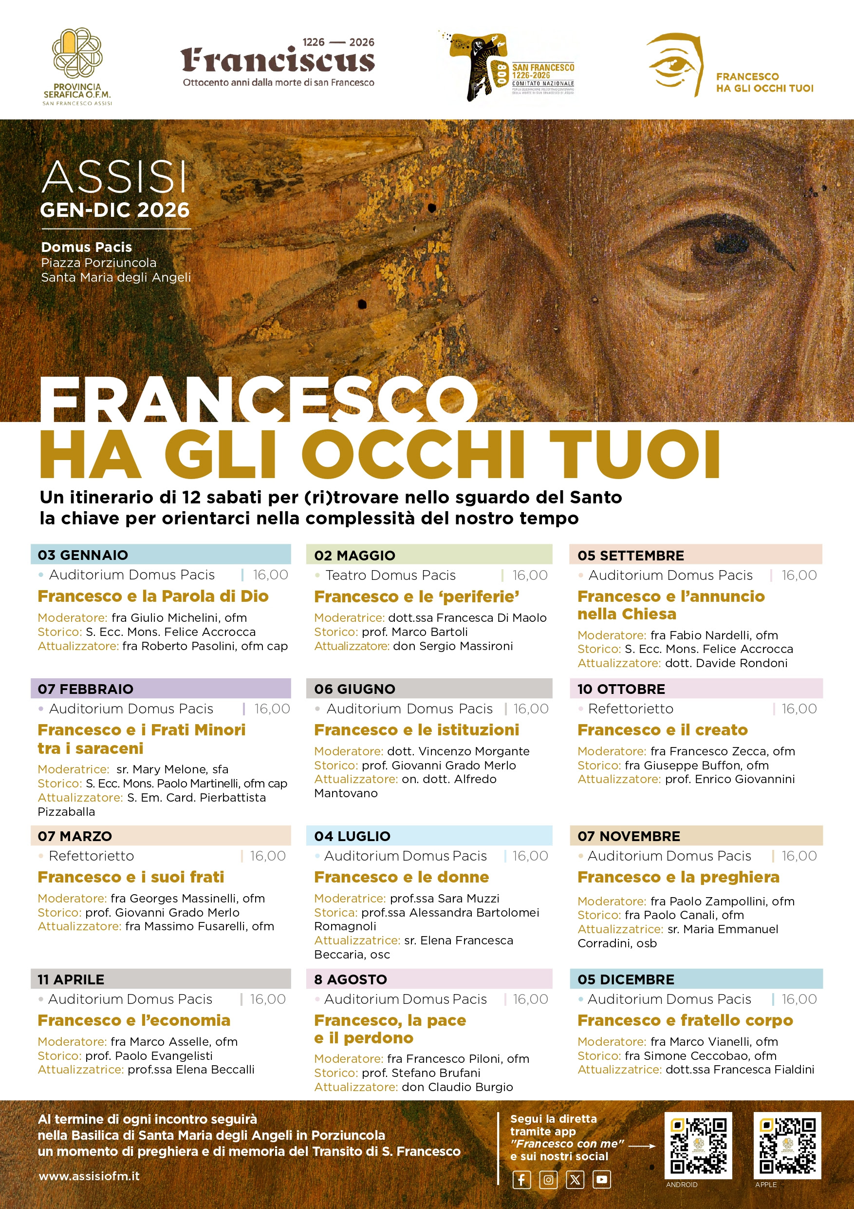 Il progetto prevede dodici incontri, uno al mese, per tutto il 2026. Gli appuntamenti si svolgeranno alla Domus Pacis di Santa Maria degli Angeli, a pochi passi dalla Porziuncola. «Abbiamo scelto di riferirci ai primi giorni di ogni mese – continua fra Francesco Piloni – per una ragione legata alla memoria: il transito di Francesco avvenne il 3 ottobre 1226, e desideriamo mantenere una vicinanza simbolica al giorno della sua morte». Ogni incontro si fonda sul dialogo tra due figure: uno storico, esperto delle fonti e della biografia di Francesco e un “attualizzatore”, capace di tradurre i valori francescani in risposte concrete alle sfide di oggi. A moderare gli appuntamenti saranno personalità del mondo della cultura e della comunicazione, per garantire un confronto chiaro, accessibile e di ampio respiro. Un calendario costellato da voci d’eccezione, espressione di profonda cultura e di solida competenza: laici e religiosi di ampio respiro intellettuale e spirituale, capaci di offrire uno sguardo penetrante e plurale sul lascito sempre vivo di Francesco.