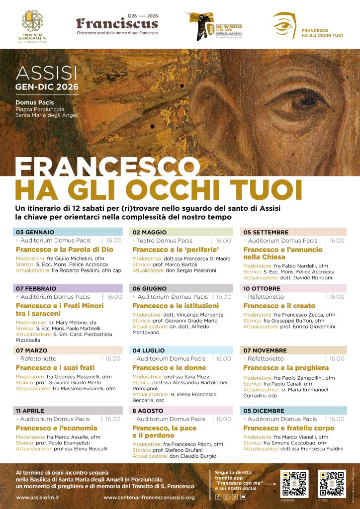 ASSISI – Dopo il grande interesse suscitato dai primi quattro appuntamenti, la rassegna “Francesco ha gli occhi tuoi” prosegue con il quinto incontro, confermandosi come uno spazio vivo di dialogo tra storia, spiritualità e attualità.
