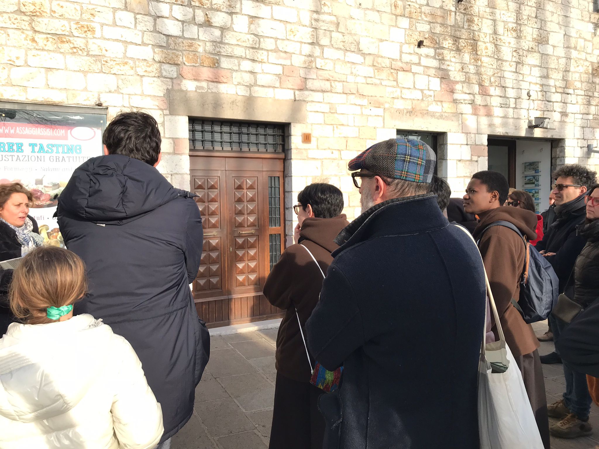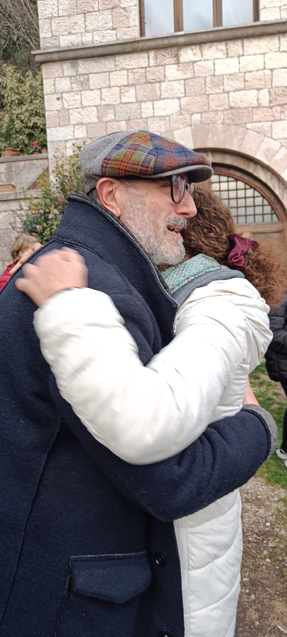 ASSISI - Dopo il convegno con i discendenti degli ebrei salvati ad Assisi, altrettanto emozionante è stato il pomeriggio di sabato 25 gennaio con un itinerario nei luoghi e tra le pietre della Memoria che ha visto la partecipazione di Emanuele Carucci, figlio di Grazia Viterbi ebrea salvata in Assisi insieme al papà, alla mamma e alla sorella Miryam. Toccanti alcuni scritti inediti della mamma, di don Aldo Brunacci, del nonno Emilio Viterbi che Carucci ha letto lungo il percorso che, partito da Borgo Aretino (dove c’è la targa dedicata a Vittorio Rinaldi e la casa dove erano nascosti i Viterbi), si è poi diretto verso piazza Santa Chiara (tipografia dei Brizi), l’ex hotel Sole (primo alloggio dei Viterbi), il Belvedere don Aldo Brunacci ed è infine arrivato alla casa di Arnaldo Fortini. Qui l'abbraccio tra il testimone e la nipote del podestà, "tra il salvato e il salvatore - ha commentato Marina Rosati - un abbraccio che è gratitudine, amicizia e vera fratellanza". Mostrata e letta anche la lettera che scrisse Viterbi per salvare Fortini, arrestato dagli alleati in quanto podestà fascista e la missiva che lo stesso scrisse al Duce per preservare Assisi dai bombardamenti e ottenere il riconoscimento di "città ospedaliera".
