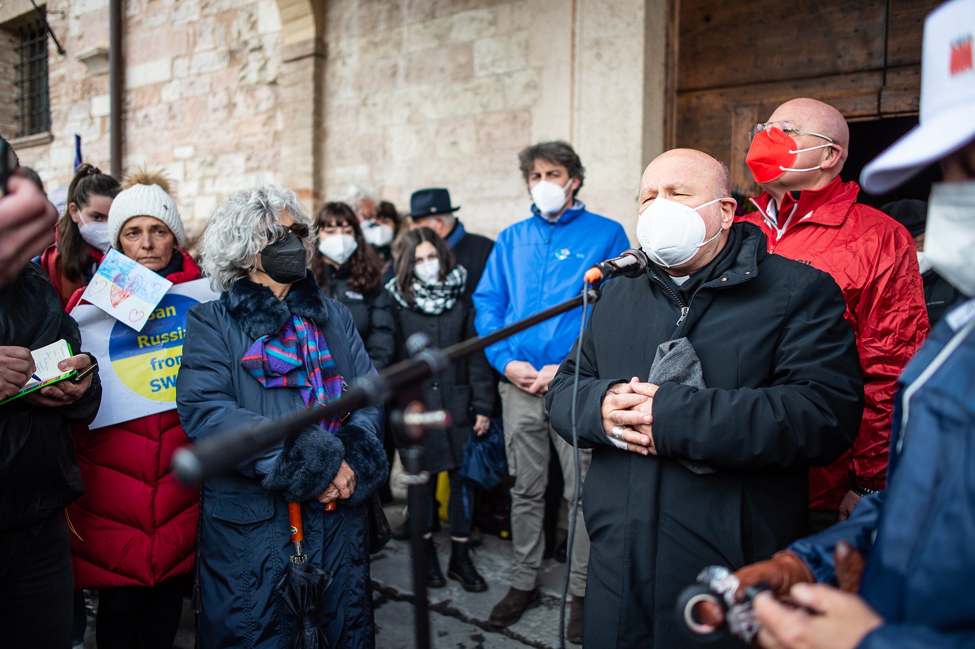 Un no, che il vescovo folignate ha ribadito con fermezza. “Desideriamo dire con forza, gridandolo, che il futuro dell’umanità è la solidarietà, è la libertà, è la giustizia per tutti i popoli e per tutte le persone. Basta con le armi – ha quindi proseguito monsignor Domenico Sorrentino, interrotto per un attimo dagli applausi della piazza -. Se ci sono problemi, se ci sono incomprensioni e accordi da fare, bisogna farli con la cordialità e la parola. Magari anche litigando, ma trovando alla fine una soluzione condivisa che sia anche appoggiata dalle istituzioni mondiali. Per questo è bello che nazioni intere come la nostra, con le Nazioni Unite, cerchino una via di soluzione di questo che non è un conflitto, ma una invasione. La diplomazia ha fatto dei passi che sembravano darci un’illusione ma, dietro questi presunti passaggi diplomatici, si nascondeva una menzogna già organizzata: tutto questo non sta bene agli occhi di Dio, non sta bene agli occhi degli uomini. Abbiamo bisogno di un mondo della verità detta con il cuore e con la sincerità. Voglio portare tutta la solidarietà della nostra Chiesa, quella di Foligno e di Assisi”.