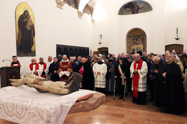 ASSISI – Venerdì 7 aprile mattina dopo la recita dell'Ufficio delle letture e delle Lodi presieduta dal vescovo monsignor Domenico Sorrentino nella cattedrale di San Rufino è seguita la processione del Cristo morto con tanti fedeli che hanno raggiunto la Basilica di San Francesco sostando presso alcuni monasteri di clausura e conventi della città.
