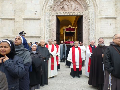Così l’abbiamo visto camminare per le nostre strade di Assisi Crocifisso tra le braccia dei suoi preti, dei pastori della sua Chiesa ai quali ieri ha detto: “Fate questo in memoria di me”, agli occhi del suo popolo, nei luoghi, nelle piazze, nei vicoli anche più bui della quotidianità, nei luoghi di preghiera, nelle nostre chiese dove qualche folle come Lui: Francesco e Chiara l’hanno seguito e Francesco sino alle stimmate, nei luoghi della sofferenza e della malattia come la Casa di Riposo Andrea Rossi… Ma camminare per le nostre strade Crocifisso significa affiancare le nostre esistenze, i nostri percorsi contorti di ricerca del Bene; le nostre storie personali, entrare nelle nostre case, nel cuore delle nostre fatiche, nel profondo di ferite sconosciute, di lacrime non asciugate, di sogni soffocati, di evasioni e trasgressioni per falsi e immediati piaceri che ci lasciano alla soglia della felicità senza poterla mai incontrare… Non possiamo chiudergli le porte ancora una volta! Non possiamo fermarci alla suggestività della Liturgia, al sensum fidei della massa, bisogna che ciascuno di noi, ciascun assisano o che da lontano per toccare al vivo queste ferite si è fatto assisano nella Settimana Santa, qualsiasi ruolo svolga, faccia la sua scelta definitiva: di essere compromesso con un amore senza riserve sempre. E se ancora chiudessimo le porte per altri tanti Tridui Pasquali, non sappiamo quanti ne abbiamo nella nostra vita, Lui resta con noi, per noi, in noi, nell’Eucaristia, nei sacerdoti, nei poveri. Ce l’ha detto prima di lasciarci: “I poveri li avete sempre con voi”, lì si fa presente per darci ancora l’opportunità di abbracciarlo almeno in quella carità e fraternità, solidarietà e sussidiarietà umane che non smuoverebbero il nostro cuore né quello di chi non crede se non venissero da Lui. Questo il messaggio, le emozioni, i propositi, gli afflati del cuore del venerdì Santo iniziato in cattedrale con la celebrazione dell’Ufficio delle letture e delle lodi mattutine presieduta dal vescovo Sorrentino e seguita dalla processione di Gesù morto per le vie di Assisi, conclusasi nella Basilica di San Francesco. Dopo la celebrazione della Passione del Signore alle 19.00 presieduta dal vescovo, l’adorazione della Croce, con la comunione all’assemblea, la preghiera universale per l’unità dei credenti e la colletta per la Terra Santa, tutto il popolo si muoverà in processione verso la Basilica di San Francesco alle 20.30 con la statua della Madonna Addolorata dalla Cattedrale di san Rufino a cercare con lei nel buio della notte, delle strade che vanno illuminandosi con la fede di Maria: il Figlio Crocifisso, per ritornare in cattedrale con il Cristo morto e la Madonna Addolorata. “Questo sostare del Crocifisso accanto al corpo di Francesco non sia solo una pia devozione tradizionale, ma ci spinga all’emulazione del Santo nel suo Amore per il Crocifisso. Rieduchiamoci al silenzio adorante e di gratitudine” con queste parole il presule ha benedetto la sua gente.