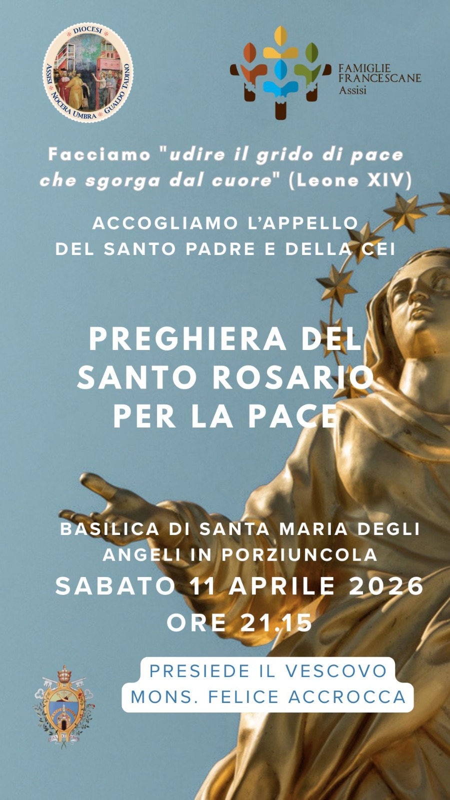 ASSISI – “Da questa città santa vogliamo elevare con forza la nostra preghiera e il nostro appello per la pace. Saremo a Santa Maria degli Angeli di fronte alla Porziuncola per recitare il santo rosario e unirci alla preghiera indetta dal Santo Padre”. Sono le parole di monsignor Felice Accrocca, vescovo delle diocesi di Assisi – Nocera Umbra – Gualdo Tadino e di Foligno, alla vigilia della veglia per la pace indetta da Papa Leone XIV per sabato 11 aprile alle ore 18,00 nella Basilica di San Pietro a Roma. La comunità diocesana, con le Famiglie francescane, e in particolare i frati minori della Porziuncola che abitualmente il sabato sera organizzano la recita del rosario, si ritroverà alle ore 21,15 nella Basilica di Santa Maria degli Angeli per accogliere l’appello del Santo Padre e pregare con monsignor Accrocca che guiderà questo momento.