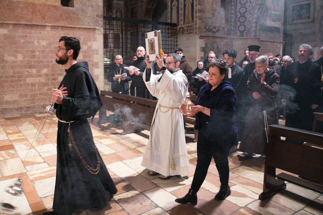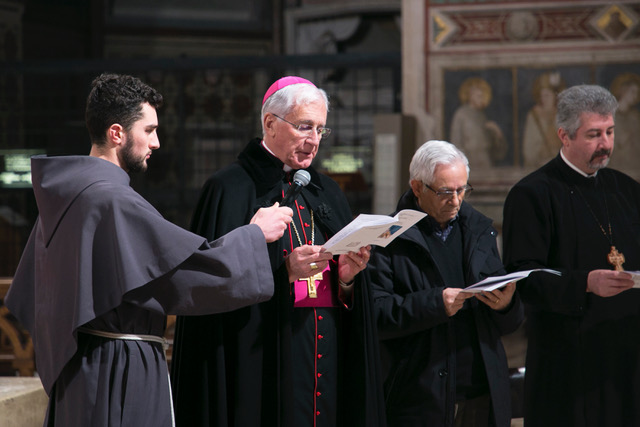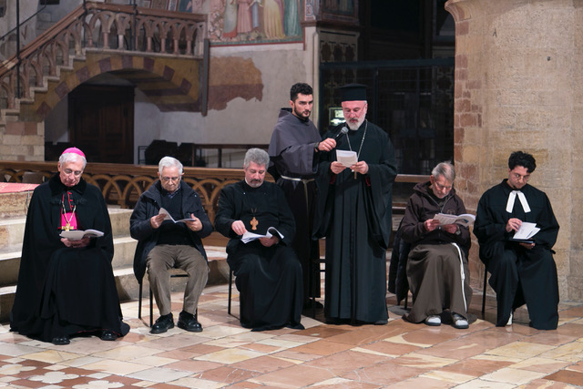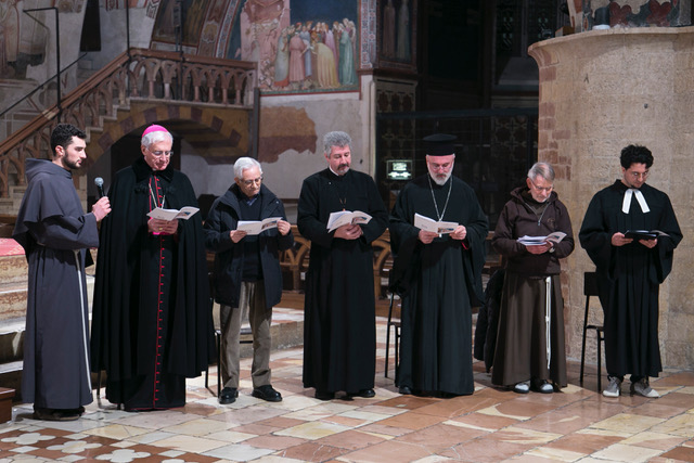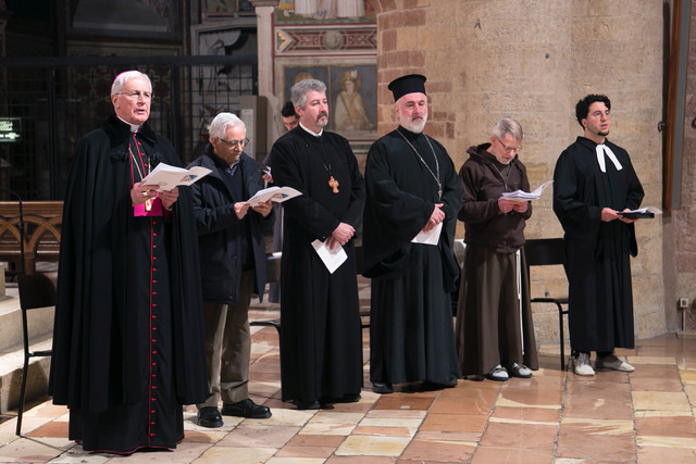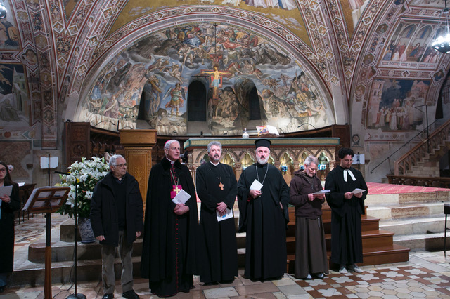 Hanno quindi guidato la celebrazione: per la Chiesa Cattolica monsignor Renato Boccardo, presidente della conferenza episcopale umbra, per la Chiesa Cristiana Avventista del Settimo Giorno il pastore emerito Calogero Fùrnari, presidente del Consiglio delle Chiese Cristiane di Perugia, padre Petru Heisu, decano della diocesi Ortodossa Romena d’Italia per le regioni Umbria e Marche, parroco delle comunità ortodosse romene di Perugia e Marsciano, padre George Khachidze, protopresbitero della Chiesa Greco – Ortodossa di San Gerasimo in Perugia, brother Benedict SSF, membro del primo ordine della Society of St Francis, comunità religiosa internazionale della Comunione Anglicana e religioso di riferimento per la congregazione anglicana in Assisi, e per la Chiesa Valdese di Perugia, il pastore Marco Casci con la presidente del consiglio della chiesa Antonella Violi.