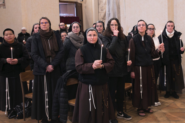 Parlando di questi due aspetti inseparabili monsignor Sorrentino ha aggiunto: “Come potrebbe un apostolo esserlo davvero, se la sua vita non fosse dedicata pienamente a Gesù, vibrante della gioia di essere il suo volto e il suo cuore per il popolo di Dio? Al tempo stesso, come potrebbe un consacrato non essere anche un apostolo, almeno nella testimonianza, più discreta o più operosa, a seconda delle vocazioni? Nella figura e nelle parole di Simeone in qualche modo le due vocazioni si incontrano. Egli è ebbro di quegli occhi con i quali il suo sguardo si incontra, e che gli portano Dio, e con lui il Paradiso, fin nelle fibre della sua umanità. Ma è insieme l’annunciatore, che spiega, tra le mura del Tempio, che ormai il Tempio ha preso la forma del bambino nato a Betlemme. Non di un Tempio fatto di mura il mondo ha bisogno. Non ha bisogno né delle nostre cattedrali né dei nostri conventi. Non ha bisogno né dei nostri manufatti sacri né delle nostre divise. Ha bisogno di uomini e donne che fissando quel volto se ne sentono innamorati, al punto che niente altro attrae il loro cuore, e sentono il desiderio di spogliarsi di sé per rivestirsi di lui. È questo – ha concluso - che vi ho chiesto, carissimi, nella lettera che vi ho inviato per stimolarvi all’apertura delle vostre strutture, dove possibile, ai poveri che soffrono sulla strada il freddo talvolta pungente di questo inverno. In questo anno dell’ottocentenario francescano, Francesco si fa Simeone al nostro sguardo, per lanciarci ancora questo messaggio. Un messaggio di gioia, di libertà, di servizio. Quello che ci fa dire in ogni condizione e in ogni stagione della nostra vita, in ogni cambiamento di comunità o di ministero: “Ora lascia Signore che il tuo servo vada in pace secondo la tua parola”. Che è come dire: sono salvo. Sono felice. Sono una persona pienamente realizzata, perché ho trovato il mio tesoro in Gesù, nostro Amore e nostro Tutto”.