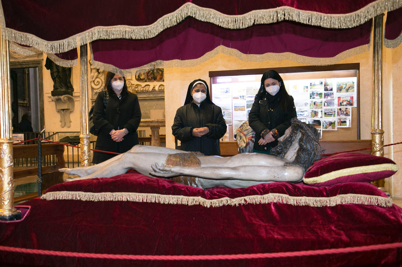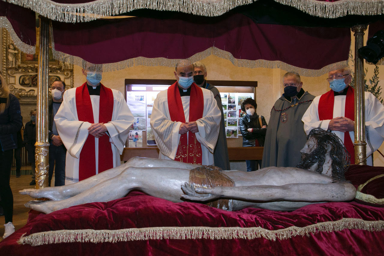 Ha fatto seguito il tradizionale rito della “Scavigliazione ” con lo scioglimento del Cristo morto dalla croce e la deposizione nel cataletto che si è svolto eccezionalmente e in maniera molto ristretta. Pur non potendo fare le processioni si è scelto di mantenere il rito in giorno e orario diverso al fine di non creare assembramento di persone, ricordando che durante l'esposizione non si poteva né baciare, né mettere i fiori sul Cristo morto. Davvero commovente il rispetto delle norme del popolo assisano così profondamente legato a questa devozione, di sobrietà, fede e accoglienza delle circostanze di questo momento. Ne pomeriggio ha fatto seguito la celebrazione della passione del Signore presieduta dal vescovo monsignor Domenico Sorrentino con la Liturgia della Parola, l'Adorazione della croce con le stesse direttive date per il Cristo morto. In un breve commento seguito alla celebrazione della Passione, il presule ha ancora incoraggiato il popolo dicendo che Dio non ci abbandona, soffre e cammina con noi, e permette momenti di prova per insegnarci ad amare come Maria che è rimasta con lui sotto la croce. Nel Venerdì Santo, oggi, la sua morte è segno di amore per tutti.