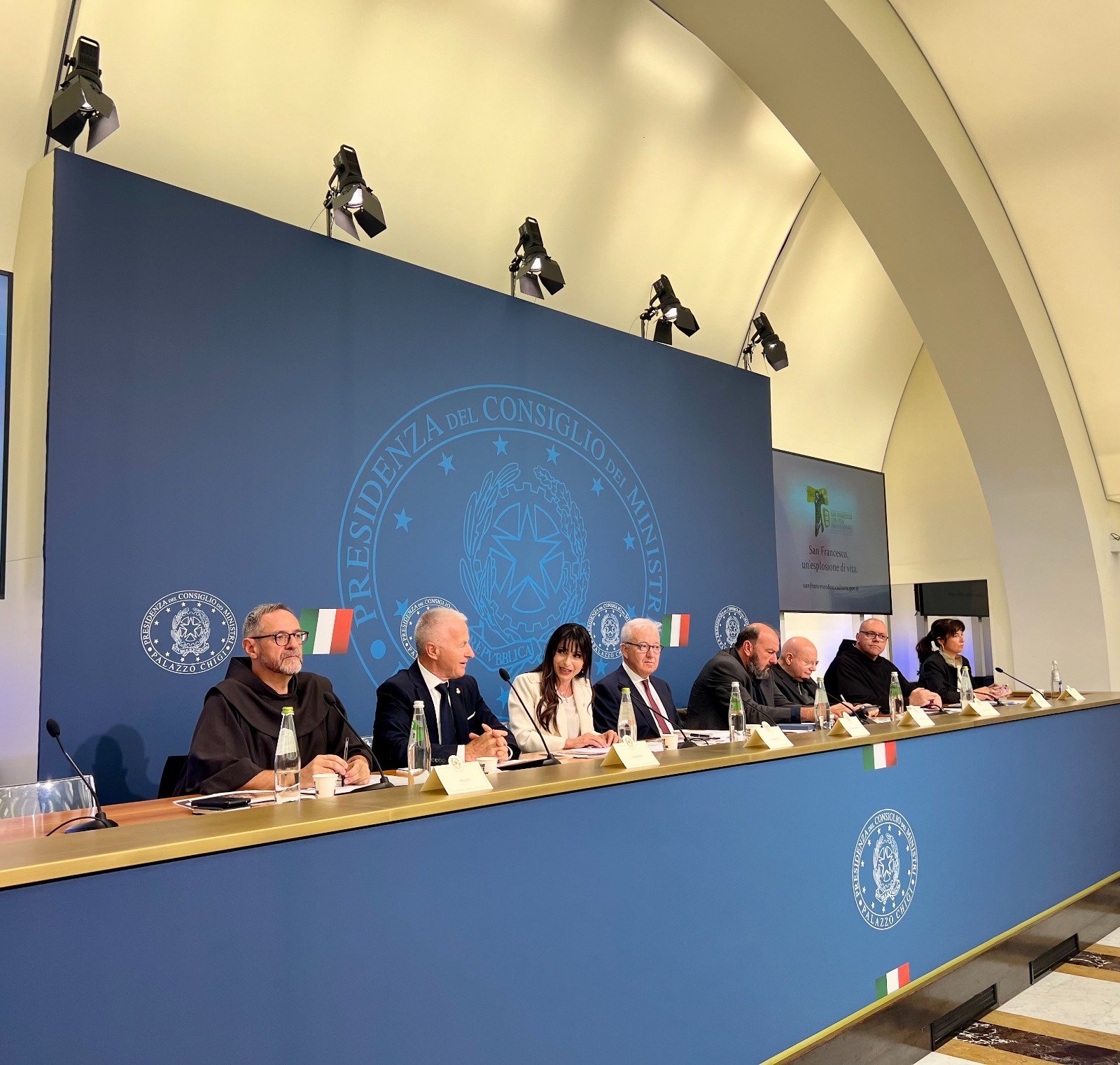 ROMA - Presentate a Palazzo Chigi a Roma le attività generali del “Comitato nazionale per l’ottavo centenario 1226-2026”, istituito dalla legge 140 del 2022 per promuovere in Italia e all’estero un ampio programma culturale, dedicato alla figura del Patrono d’Italia. Il tema progetto è “San Francesco, un’esplosione di vita”, in anteprima è stato presentato anche lo spot dedicato che andrà in onda in ambito nazionale. All’incontro - nel corso della quale è stata annunciata anche l’ostensione del corpo di San Francesco alla venerazione del pubblico - hanno partecipato, fra gli altri, Alfredo Mantovano, sottosegretario alla presidenza del Consiglio dei Ministri, Stefania Proietti, presidente della Regione Umbria, Davide Rondoni, presidente del Comitato nazionale, mons. Domenico Sorrentino, vescovo di Assisi, Nocera Umbra, Gualdo Tadino e di Foligno, fra Marco Moroni, custode del Sacro Convento d’Assisi, fra Francesco Piloni, ministro provinciale dell’ordine dei Frati Minori, diversi esponenti del Governo e componenti del Comitato.