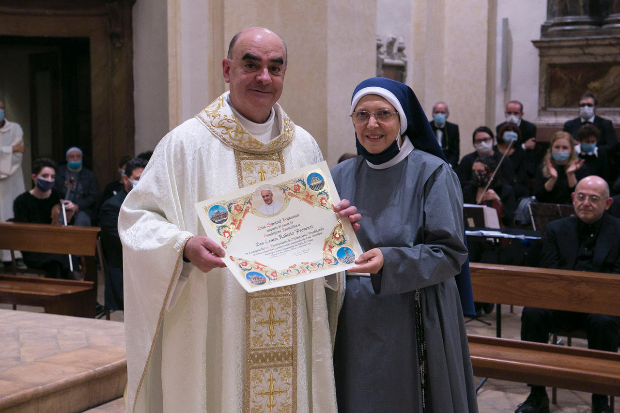 ASSISI - Domenica 27 settembre pomeriggio, nel rispetto delle norme di sicurezza, nella cattedrale di san Rufino è stata celebrata la santa messa per il 25esimo anniversario di sacerdozio di don Cesare Provenzi. I tanti fedeli presenti si sono uniti alla sua lode e rendimento di grazie al Signore per aver “incarnato” nella diocesi di Assisi – Nocera Umbra – Gualdo Tadino e nella cattedrale di san Rufino il suo stile di prete dalle “mani sempre aperte e accoglienti”, dalla potenza interiore dello Spirito e dallo sguardo sapiente della carità che tutto spera e tutto crede, trasformando la “casa di preghiera” anche di vissuti quotidiani, di gioie e dolori condivisi, di comunione e attenzione pastorale per tutti, senza distinzioni, una sola lecita preferenza: i poveri e i giovani. Un’omelia all’insegna del grazie, di quel “non sentirsi mai adeguato e all’altezza di una chiamata la cui risposta è stata travagliata, a volte rimandata, ma la certezza di un prete poi vescovo monsignor Sergio Goretti che gli ripeteva: ‘Tu sei chiamato a essere prete e sarai prete’, la spinta definitiva al Si”, la cui fedeltà oggi per don Cesare risplende nella Chiesa. Una frase ricca di discernimento perché in questi anni a servizio della diocesi di Assisi – Nocera Umbra – Gualdo Tadino per la sua “creatività pastorale” e il “culto del Bello” che lo contraddistinguono, don Cesare ha rivestito ruoli rilevanti oltre che di parroco, priore, insegnante e vicario, nella Caritas, nell’amministrazione e nel Museo diocesano, animato sempre da una tenace fiducia nella Provvidenza, instancabile nella ricerca di beni e bellezze perdute e di “percorsi nuovi” di evangelizzazione. Ha spezzato la Parola e il Pane eucaristico sull’altare come nei luoghi della vita dove ogni giorno si snodano “i suoi passi … in ascolto”. “Imprenditore di Dio” nella costruzione del Bene Comune e di ciascuno; “prete della strada” prossimo a tutti; “prete del sagrato” che unisce la cattedrale alla città di Assisi, mediatore efficace tra preghiera e vita. Lo hanno confermato la partecipazione calorosa delle tre parrocchie dove ha svolto il suo ministero: Torchiagina, San Gregorio, le Viole e San Rufino dove a suo dire: “Ha cominciato a sporcarsi le mani nell’ascolto, nella vicinanza alle famiglie, ai giovani, entrando nelle loro case, sposando la loro quotidianità perché – ha dichiarato – ho visto sempre la parrocchia come la mia famiglia e se oggi sono qui lo devo proprio al fatto di essere stato da questa famiglia tanto amato”. Un amore ricambiato e dimostrato dagli omaggi e dalle parole affettuose e riconoscenti a conclusione della celebrazione di varie rappresentanze delle tre parrocchie, dalla presenza dei suoi cari venuti da Bergamo per l’occasione suo fratello Giuseppe con la moglie Marisa e la nipote Alice che alla sua ordinazione sacerdotale a sette anni gli aveva recitato una poesia; il sindaco Stefania Proietti a nome di tutto il Comune per la sua instancabile presenza anche in momenti difficili della città di Assisi, i giovani dell’oratorio “Regina Pacis”, la Nobile Parte di Sopra con i suoi tamburi e danze, il coro della cappella di san Rufino che ha magistralmente animato la celebrazione guidato dal maestro Lucio Sambuco con due brani inediti composti per l’occasione, le Suore francescane Immacolatine che operano nella cattedrale per l’occasione più che mai adorna come una sposa di fiori, simboli e addobbi; i sacerdoti del Vicariato che hanno concelebrato e il viceparroco don Alessandro Picchiarelli animatore di tutto l’evento con la collaborazione di tutti e, infine, la Benedizione di Papa Francesco inviata su pergamena dal Vaticano. Un “evento di cielo e di terra”, solenne, ma anche dal sapore familiare e conviviale, intriso di emozioni e gioie pure, di convivialità nell’agape fraterna con cui si è concluso l’evento. Grazie don Cesare per il dono di 25 anni di sacerdozio in cui hai “innalzato il calice della salvezza”, grati per tutte le volte che quel calice l’hai innalzato per tutti noi, colmandolo dei nostri sogni, speranze, gioie e fatiche, fedele alla consegna incondizionata di tutto te stesso alla Chiesa, all’amore del Padre del quale il tuo sacerdozio resta per noi e continuerà a essere il riflesso più bello.