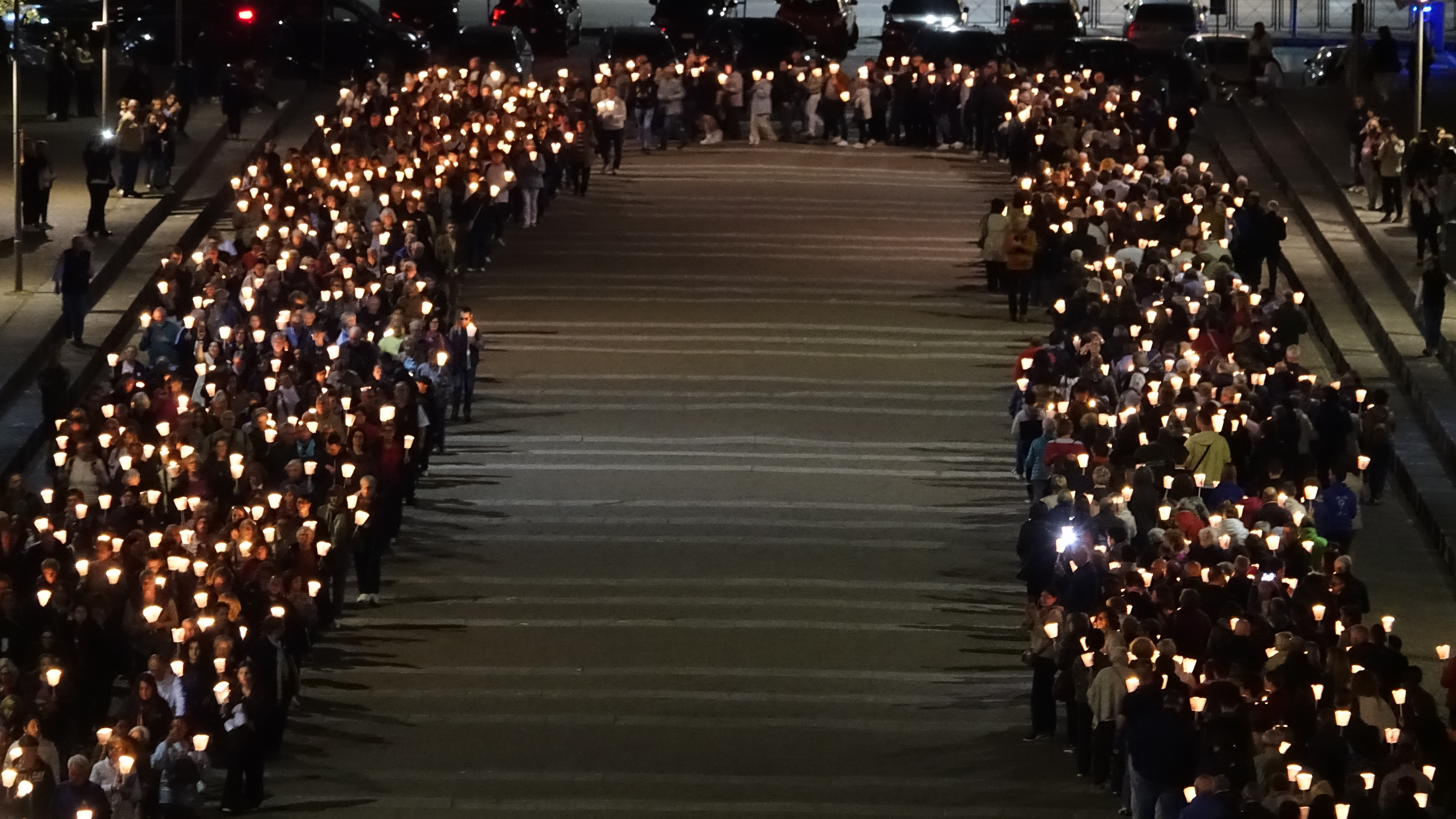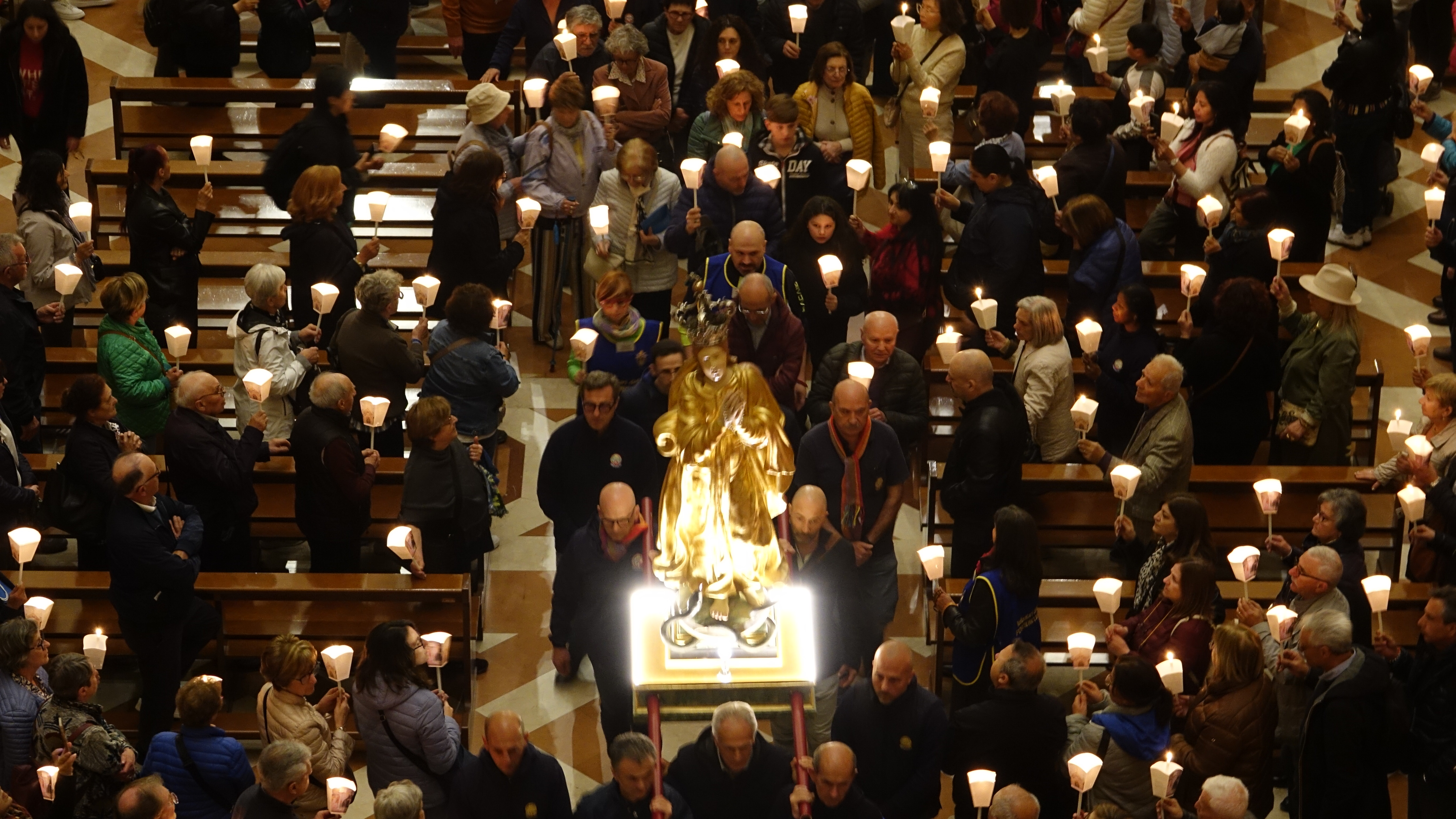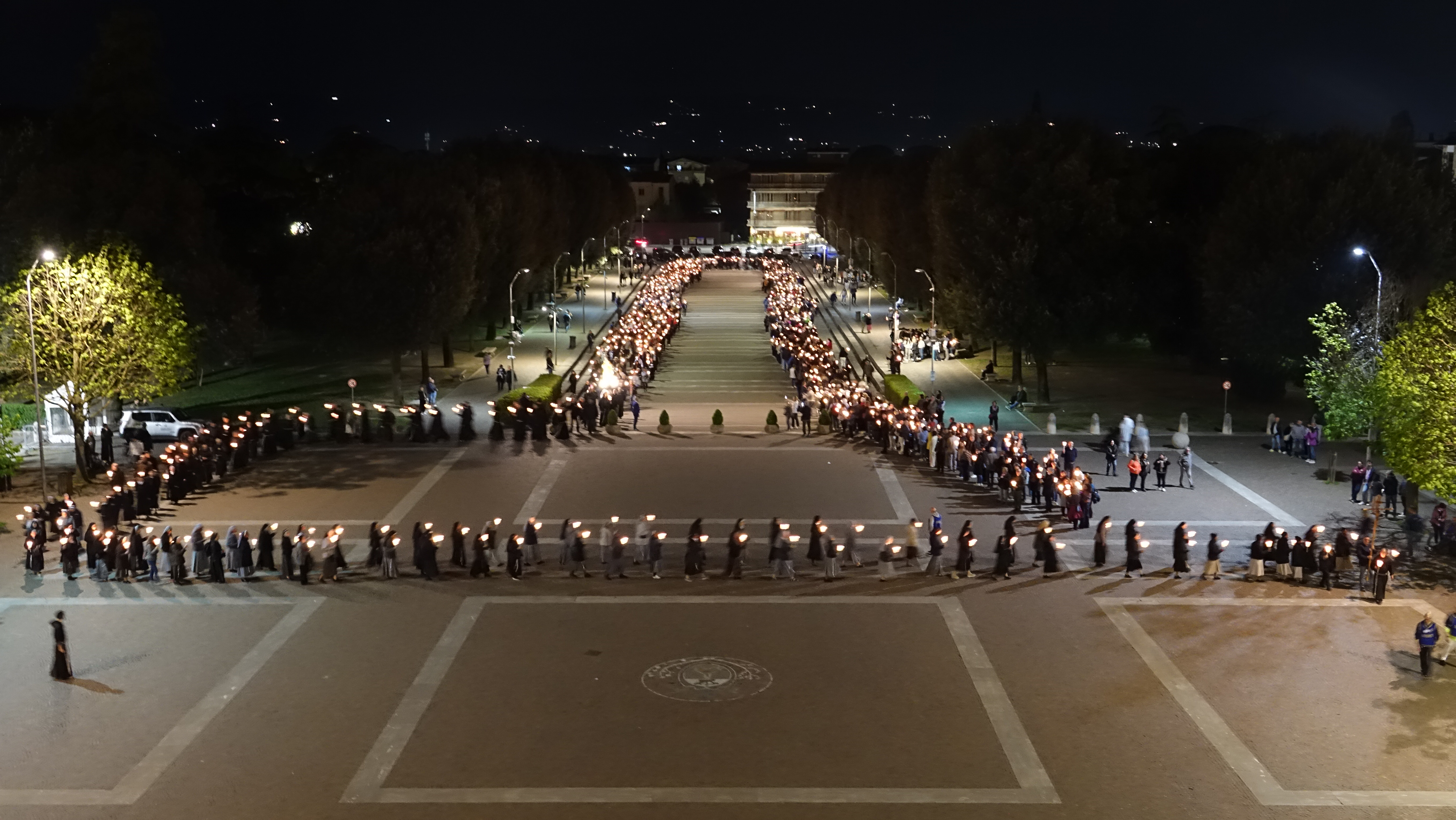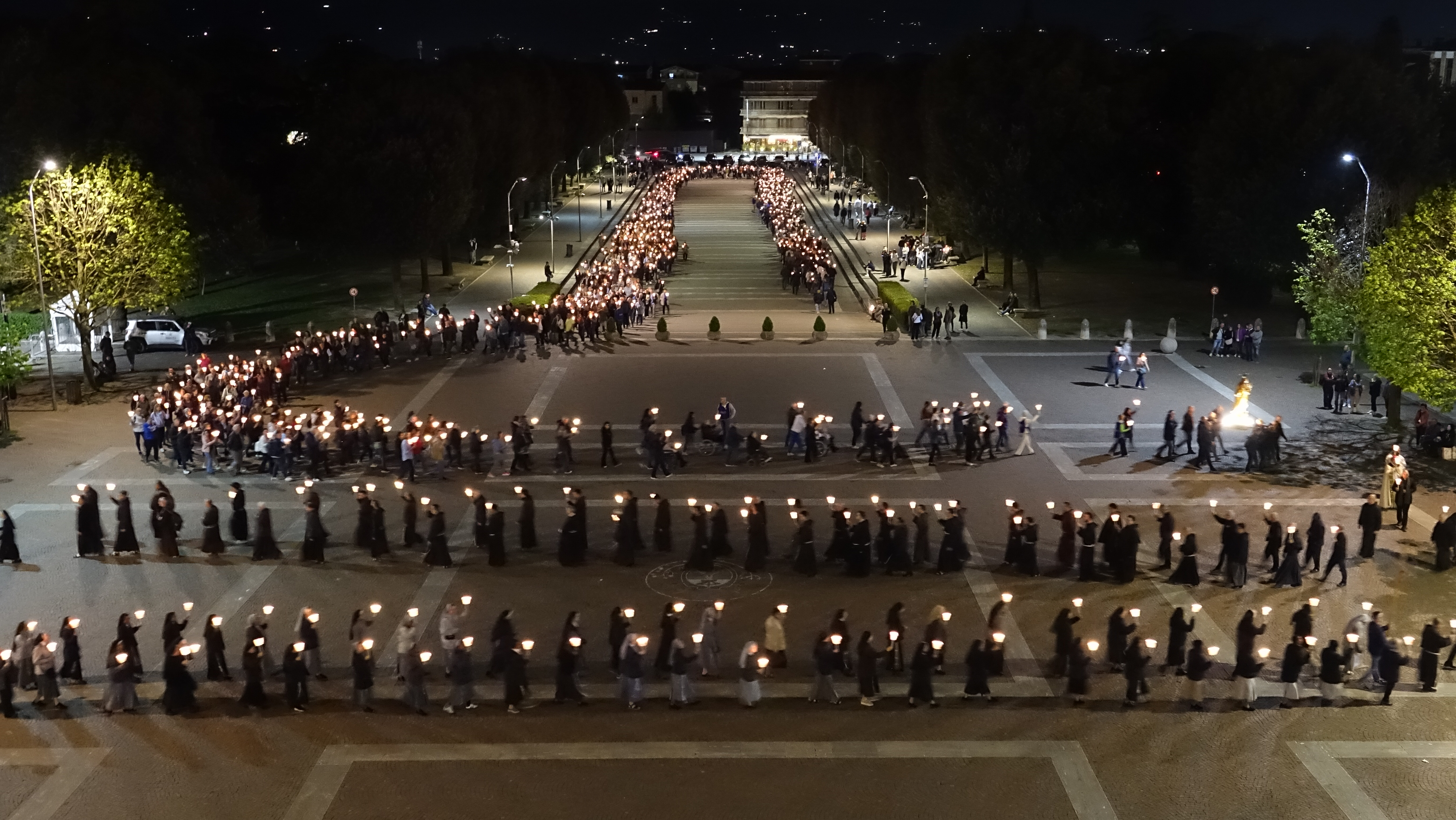 Sono stati tanti i sacerdoti, i religiosi, le religiose e i fedeli che hanno partecipato, in un clima di grande raccoglimento, alla preghiera del santo rosario iniziata nella Basilica e proseguita con la processione aux flambeaux sulla piazza antistante la Basilica, accompagnando la statua della Madonna tra canti e preghiere.