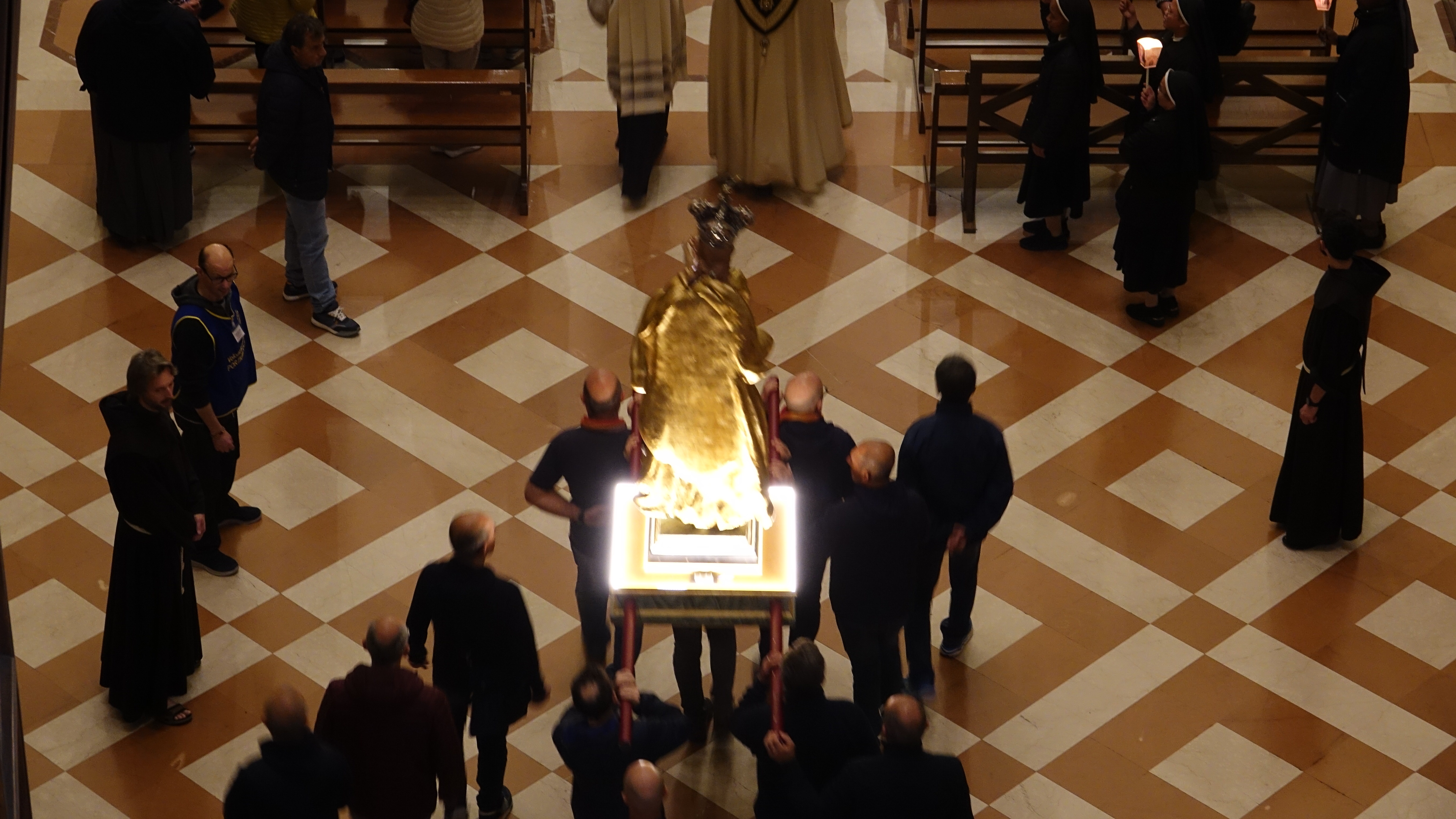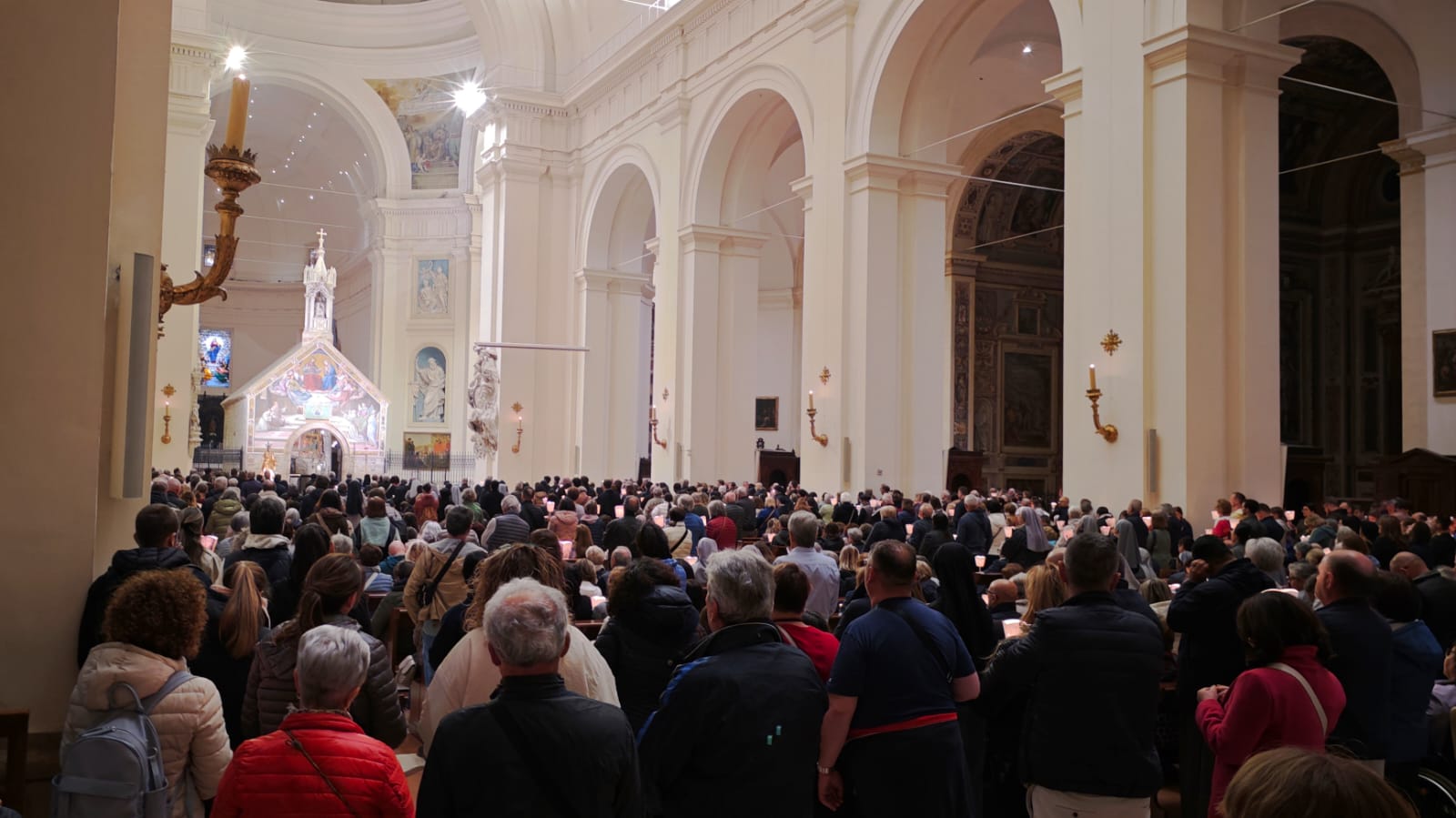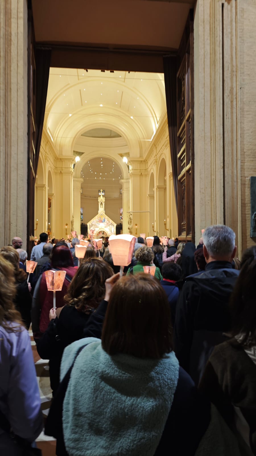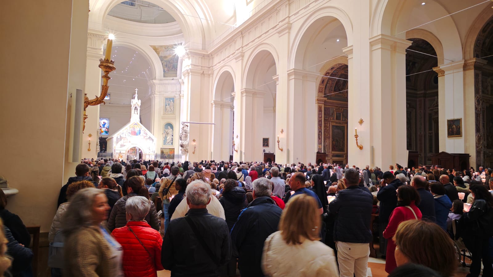 Sono stati tanti i sacerdoti, i religiosi, le religiose e i fedeli che hanno partecipato, in un clima di grande raccoglimento, alla preghiera del santo rosario iniziata nella Basilica e proseguita con la processione aux flambeaux sulla piazza antistante la Basilica, accompagnando la statua della Madonna tra canti e preghiere.