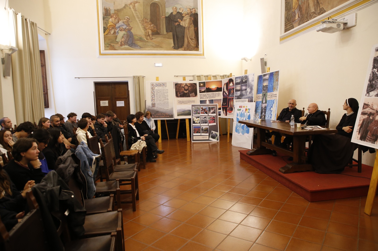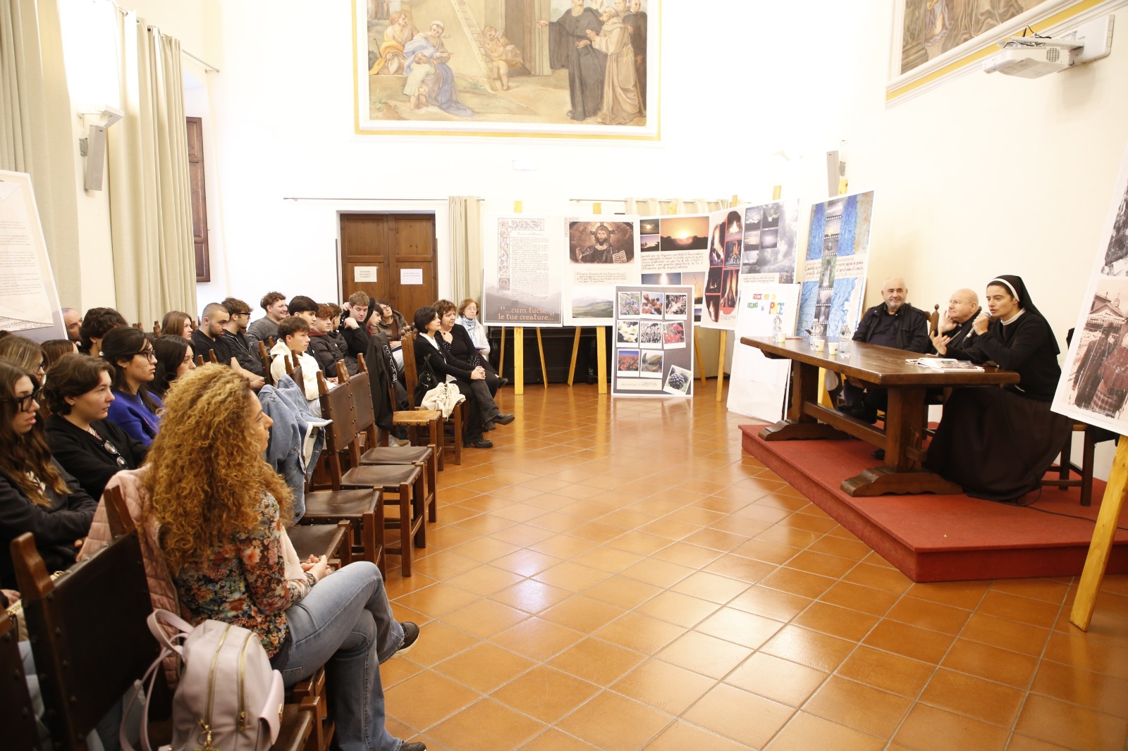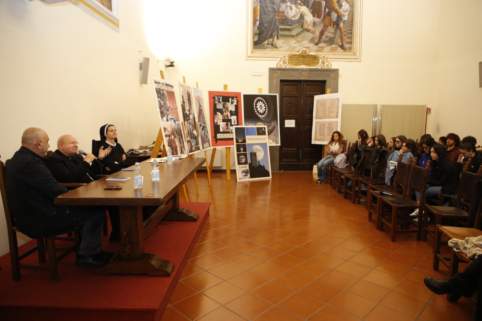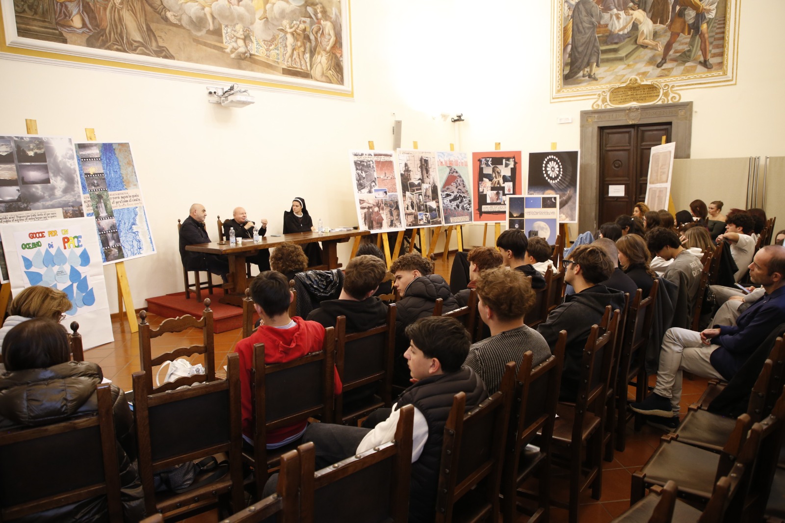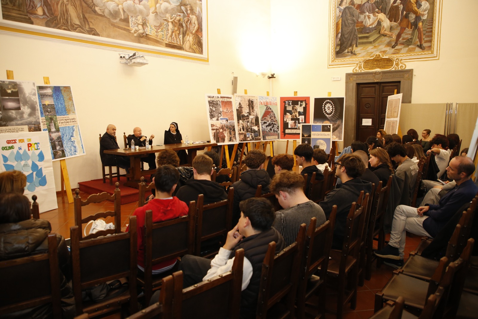 ASSISI - "La pace richiede energia, coraggio e una connessione con ciò che abbiamo attorno. La pace è soprattutto un atteggiamento del cuore che tutti noi dovremmo imparare". Lo ha detto suor Chiara Cavazza, direttrice dell'Ufficio vocazioni dell'arcidiocesi di Bologna nel corso dell'iniziativa dello Spirito di Assisi con gli studenti che si è svolta giovedì 30 ottobre nella sala della Spogliazione del palazzo Vescovile al quale hanno preso parte anche il vescovo delle diocesi di Assisi - Nocera Umbra - Gualdo Tadino e di Foligno, monsignor Domenico Sorrentino e il presidente della commissione diocesana dello Spirito di Assisi, don Tonio Dell'Olio. Gli studenti della V As del liceo Properzio, accompagnati dagli insegnanti Eleonora Luzi, Luigi Proietti e Anna Di Lorenzo e del IV CAT dell'istituto Ruggero Bonghi, con i docenti Elisabetta Apostolico e Daniela Martelli, hanno partecipato attivamente all'incontro rivolgendo diverse domande ai relatori e proponendo le loro riflessioni sulla pace. In particolare i ragazzi del liceo hanno creato un cartellone con le diverse declinazioni della parola pace come rispetto, libertà, accettazione, gentilezza. Il vescovo Sorrentino, ricordando i gesti di pace di San Francesco che proprio nel Vescovado sono avvenuti, ha ribadito che "la pace ci potrà essere solo se si diventa "uomini e donne di pace dentro, nel cuore, nella propria vita quotidiana". Nel moderare il dialogo, don Tonio ha ricordato l'importanza di una pace disarmata e disarmante come ha detto papa Leone IV e ha invitato gli studenti a farsi protagonisti del cambiamento. L'iniziativa, organizzata in collaborazione con l'Ufficio Scuola guidato da Anna Maria Bettuzzi, si è svolta a conclusione dell'edizione dello Spirito di Assisi di quest'anno che ha visto il vescovo Sorrentino e una delegazione diocesana partecipare agli eventi organizzati a Roma dalla Comunità di Sant'Egidio, in occasione del 39esimo anniversario dello storico incontro per la pace del 27 ottobre 1986 voluto da San Giovanni Paolo II.