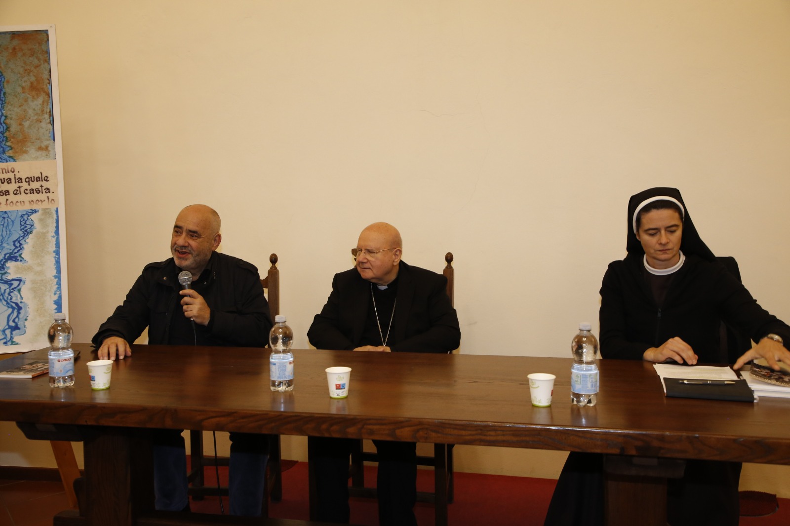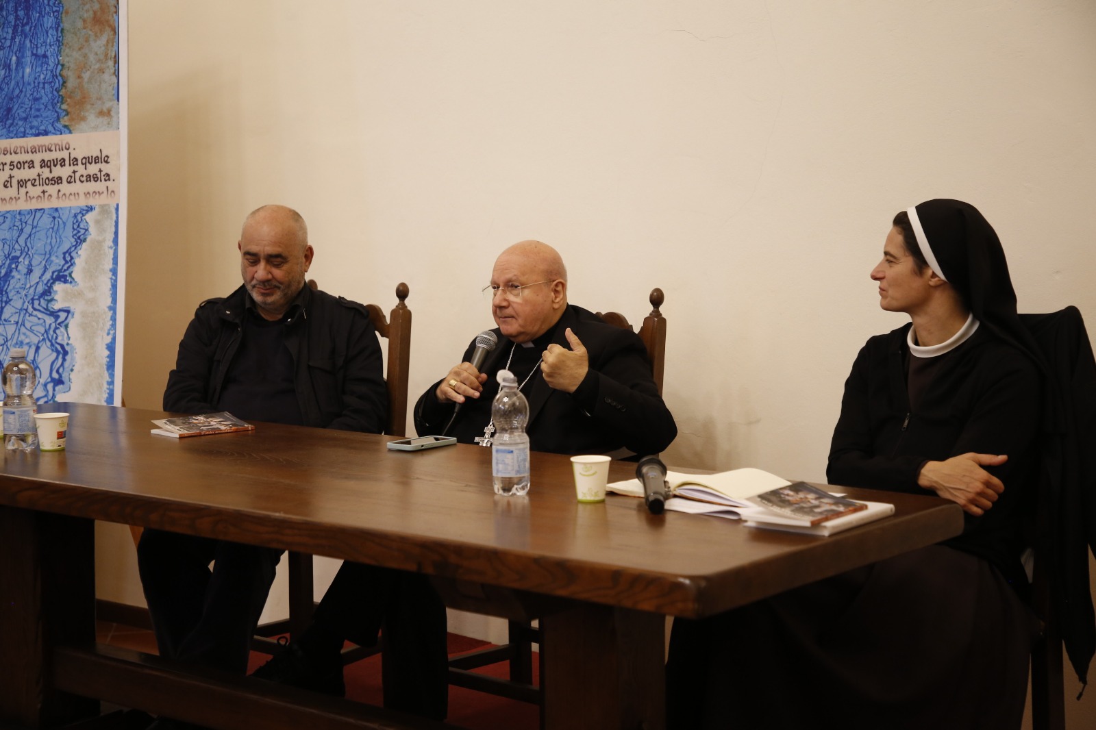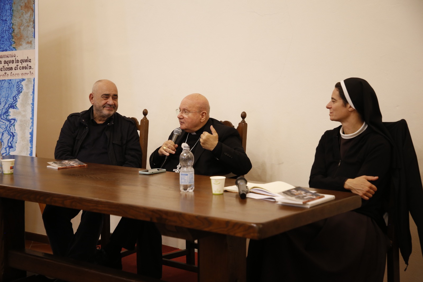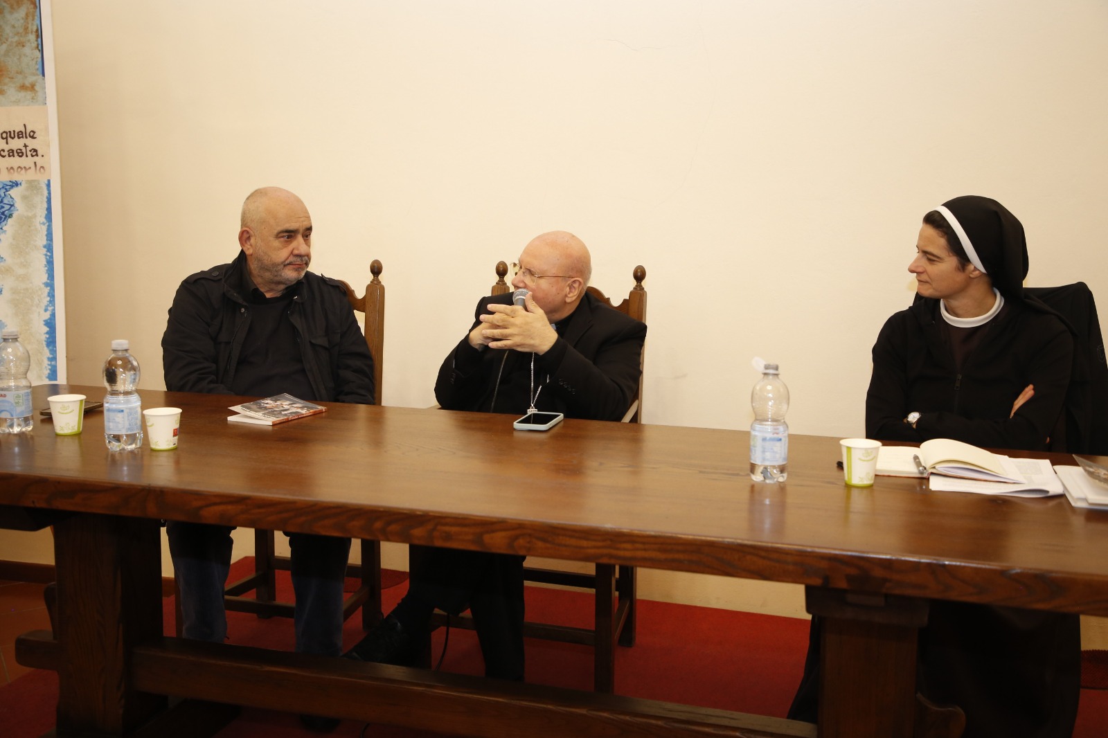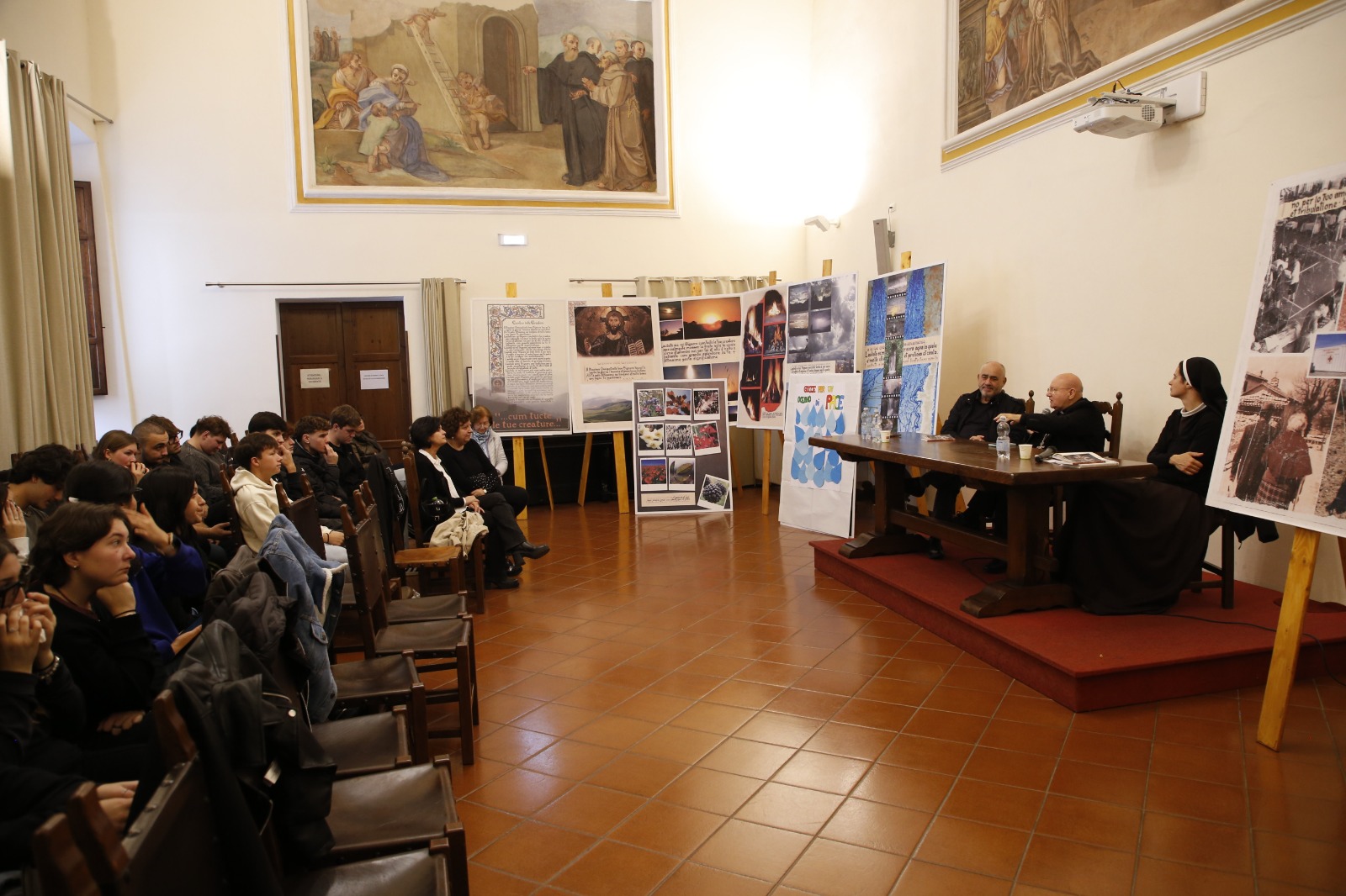ASSISI - "La pace richiede energia, coraggio e una connessione con ciò che abbiamo attorno. La pace è soprattutto un atteggiamento del cuore che tutti noi dovremmo imparare". Lo ha detto suor Chiara Cavazza, direttrice dell'Ufficio vocazioni dell'arcidiocesi di Bologna nel corso dell'iniziativa dello Spirito di Assisi con gli studenti che si è svolta giovedì 30 ottobre nella sala della Spogliazione del palazzo Vescovile al quale hanno preso parte anche il vescovo delle diocesi di Assisi - Nocera Umbra - Gualdo Tadino e di Foligno, monsignor Domenico Sorrentino e il presidente della commissione diocesana dello Spirito di Assisi, don Tonio Dell'Olio. Gli studenti della V As del liceo Properzio, accompagnati dagli insegnanti Eleonora Luzi, Luigi Proietti e Anna Di Lorenzo e del IV CAT dell'istituto Ruggero Bonghi, con i docenti Elisabetta Apostolico e Daniela Martelli, hanno partecipato attivamente all'incontro rivolgendo diverse domande ai relatori e proponendo le loro riflessioni sulla pace. In particolare i ragazzi del liceo hanno creato un cartellone con le diverse declinazioni della parola pace come rispetto, libertà, accettazione, gentilezza. Il vescovo Sorrentino, ricordando i gesti di pace di San Francesco che proprio nel Vescovado sono avvenuti, ha ribadito che "la pace ci potrà essere solo se si diventa "uomini e donne di pace dentro, nel cuore, nella propria vita quotidiana". Nel moderare il dialogo, don Tonio ha ricordato l'importanza di una pace disarmata e disarmante come ha detto papa Leone IV e ha invitato gli studenti a farsi protagonisti del cambiamento. L'iniziativa, organizzata in collaborazione con l'Ufficio Scuola guidato da Anna Maria Bettuzzi, si è svolta a conclusione dell'edizione dello Spirito di Assisi di quest'anno che ha visto il vescovo Sorrentino e una delegazione diocesana partecipare agli eventi organizzati a Roma dalla Comunità di Sant'Egidio, in occasione del 39esimo anniversario dello storico incontro per la pace del 27 ottobre 1986 voluto da San Giovanni Paolo II.