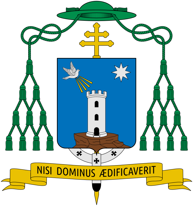 Lo stemma di Monsignor Felice Accrocca, arcivescovo, vescovo delle diocesi di Assisi – Nocera Umbra – Gualdo Tadino e di Foligno dal 2026, è uno scudo sannitico d’azzurro con una torre d’argento su roccia, simbolo della Chiesa di Benevento e della stabilità in Cristo. Include una colomba radiosa e una stella a 8 punte, richiamando il motto “Nisi Dominus ædificaverit“.