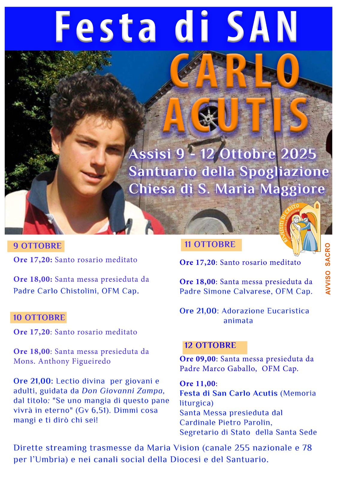 ASSISI – Assisi, tutta la diocesi e la comunità si preparano a vivere la canonizzazione di Carlo Acutis, celebrata da Papa Leone XIV, domenica 7 settembre alle ore 10,00 in piazza San Pietro a Roma. Mentre circa 800 pellegrini arriveranno dall’Umbria con il treno speciale attivato dalla diocesi, in Assisi, quella domenica, sono previsti diversi momenti per seguire e vivere questo momento di grazia per celebrare … Continua a leggere CANONIZZAZIONE CARLO ACUTIS, CELEBRAZIONI E MOMENTI IN ASSISI »