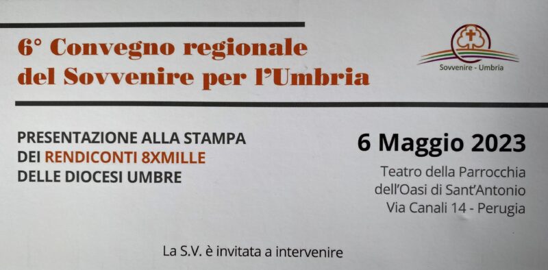 PERUGIA – Sarà presentato a Perugia, presso il Teatro parrocchiale dell’Oasi di Sant’Antonio (via Canali), sabato 6 maggio, alle ore 11,15, nel corso del 6° convegno regionale del Sovvenire, il “Rendiconto 2021 dell’8xMille delle diocesi dell’Umbria. I progetti, le opere, i benefici per le comunità”, a cura della Conferenza episcopale umbra (Ceu). La presentazione si terrà in conferenza stampa – in presenza – a cui … Continua a leggere PERUGIA: PRESENTAZIONE ALLA STAMPA DEL “RENDICONTO 2021 DELL’8XMILLE ALLE DIOCESI DELL’UMBRIA”