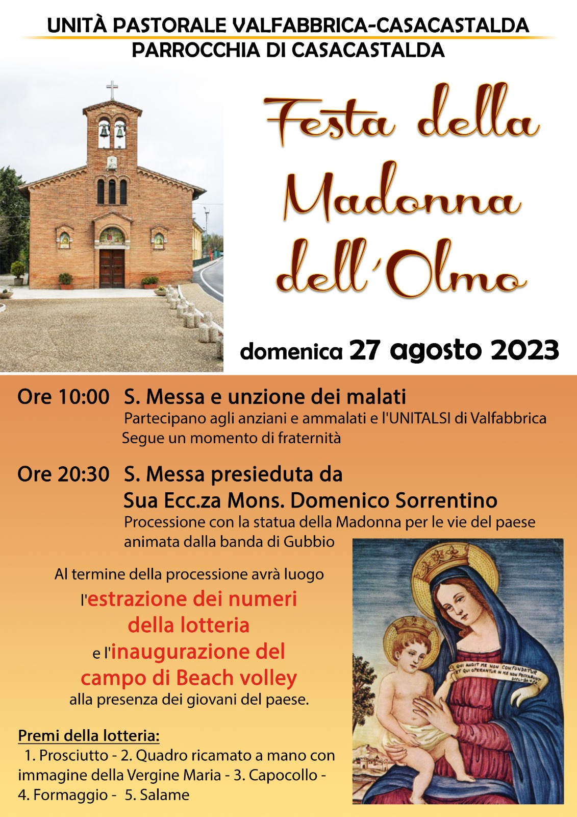 ASSISI – Domenica 27 agosto l’unità pastorale di Valfabbrica-Casacastalda e nello specifico la parrocchia di Casacastalda celebra la festa della Madonna dell’Olmo, che si tiene due volte l’anno, il 22 maggio, giorno dell’apparizione, e appunto in estate. Il programma è il seguente: alle ore 10 la santa messa con l’unzione dei malati, partecipano infatti gli anziani, gli ammalati e l’Unitalsi di Valfabbrica, seguirà un momento di fraternità; alle ore 20:30 la santa messa presieduta dal vescovo monsignor Domenico Sorrentino, con la processione con la statua della Madonna per le vie del paese animata dalla banda di Gubbio. Al termine della processione ci sarà l’estrazione dei numeri della lotteria e l’inaugurazione del campo di beach volley alla presenza dei giovani del paese.