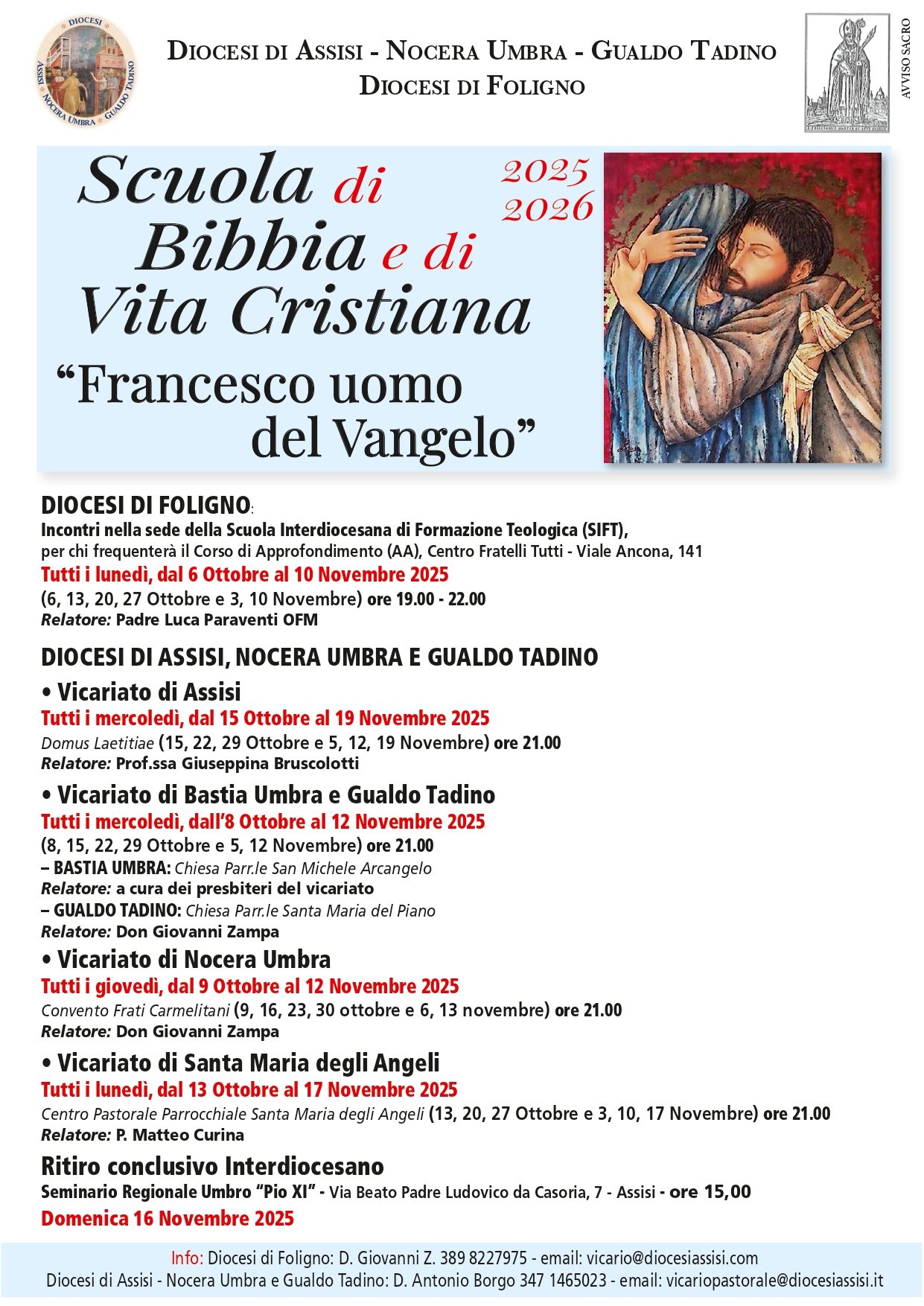 ASSISI – Torna la Scuola di Bibbia e di Vita Cristiana delle diocesi di Assisi – Nocera Umbra – Gualdo Tadino e di Foligno. L’edizione 2025-2026, che prenderà il via ad ottobre con differenti date a seconda dei vicariati, è dedicata a a: “Francesco, uomo del Vangelo”. I relatori coinvolti sono: padre Luca Paraventi, la professoressa Giuseppina Bruscolotti, don Giovanni Zampa e padre Matteo Curina. Al termine del percorso è previsto un incontro conclusivo il 16 novembre a partire dalle 15 al Seminario regionale umbro “Pio XI”. Per informazioni per chi partecipa a Foligno ci si può rivolgere a don Giovanni Zampa (vedi locandina) mentre per la diocesi di Assisi – Nocera – Gualdo bisogna far riferimento a don Antonio Borgo. (Per le date e gli orari di tutti i vicariati far riferimento a questa locandina e non ad altre stampate o distribuite).