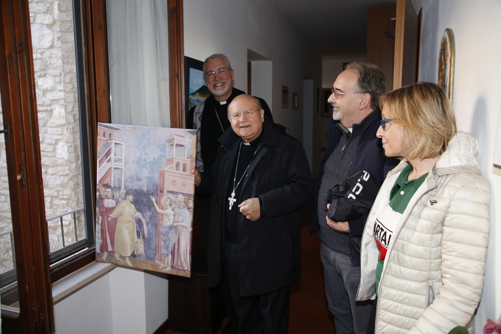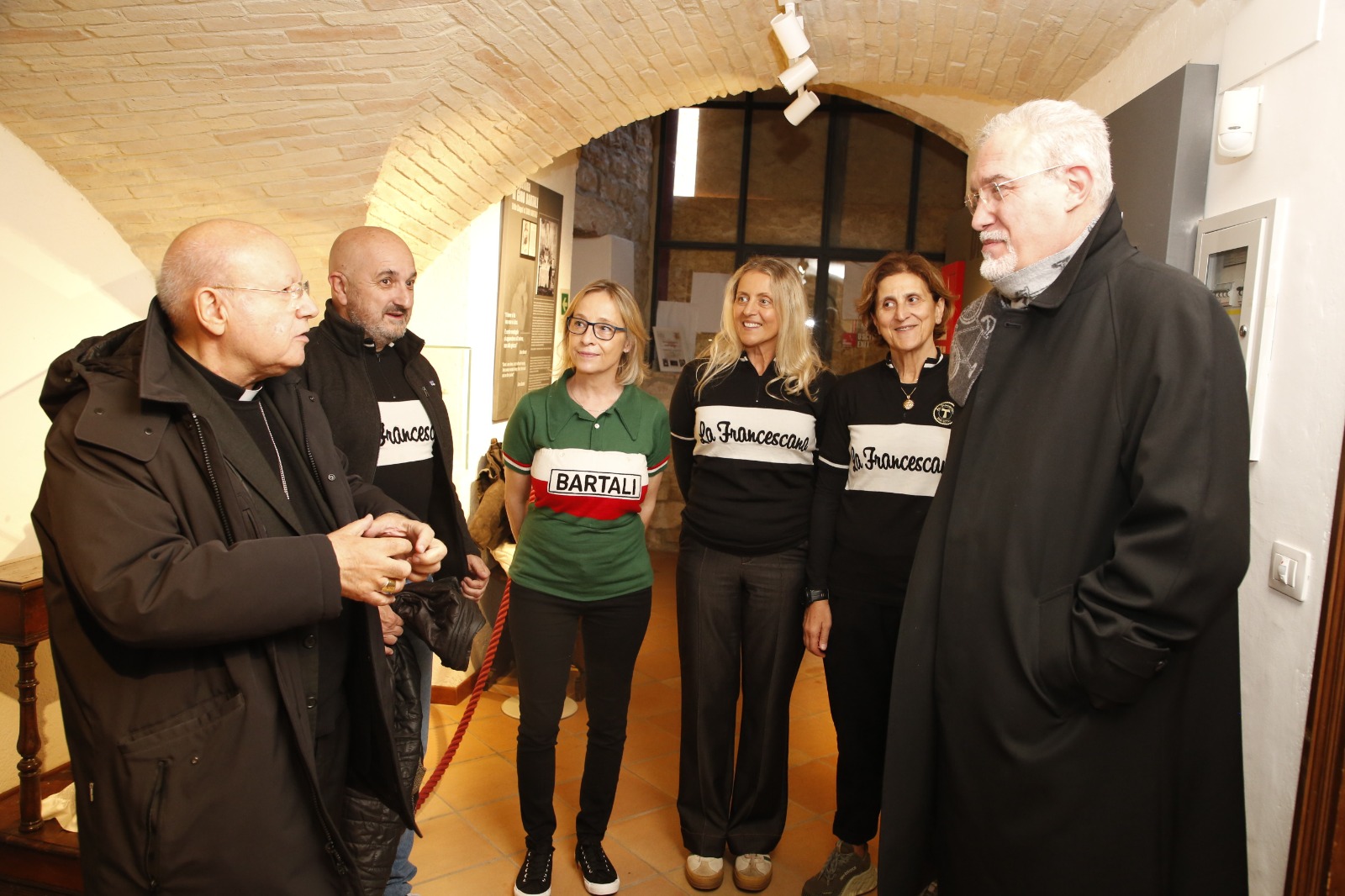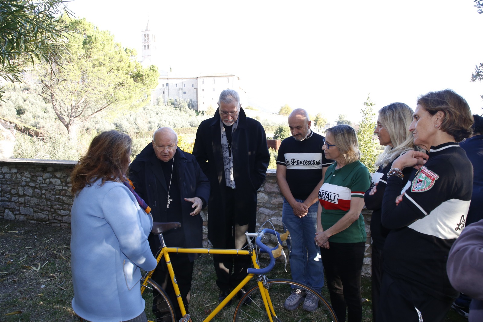 ASSISI - Una bicicletta degli anni '50 a marchio Bartali e restaurata con un telaio e altri pezzi d'epoca, in dono al Museo della Memoria. La consegna si è svolta martedì 11 novembre, nel corso di un pomeriggio a cui hanno partecipato monsignor Attilio Nostro, vescovo di Mileto-Nicotera-Tropea e segretario della Conferenza episcopale calabra, proprietario della bici, monsignor Domenico Sorrentino, vescovo delle diocesi di Assisi - Nocera Umbra - Gualdo Tadino e di Foligno, Gioia Bartali, nipote del grande campione, e Marina Rosati, direttrice del Museo della Memoria, Assisi 1943-1944.