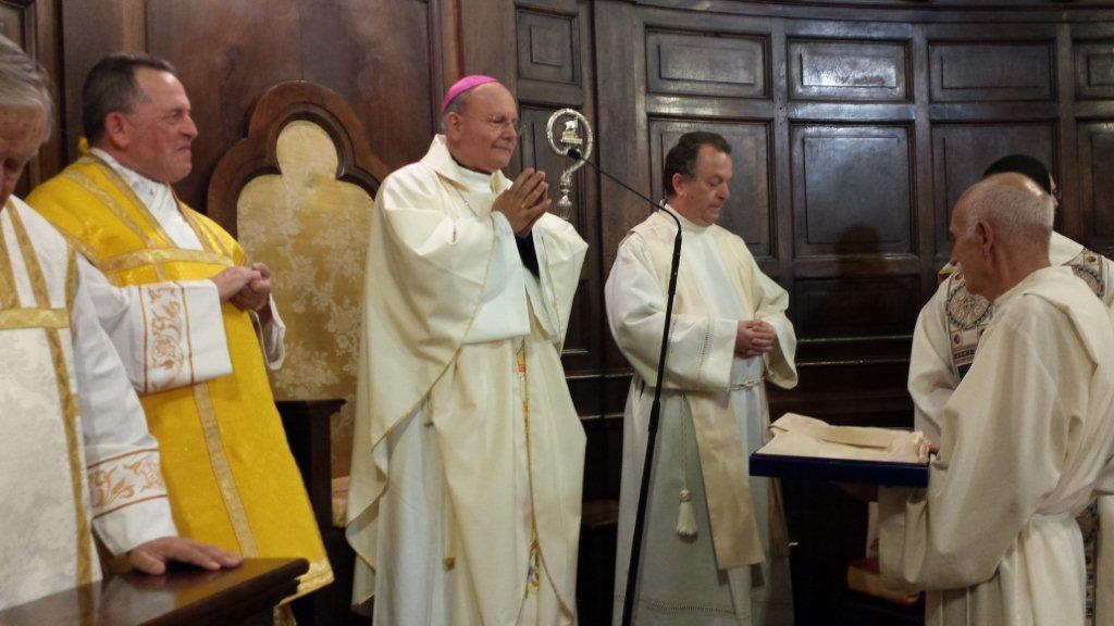 GUALDO TADINO – La famiglia è la protagonista prima dell’educazione dei figli. Anche per il catechismo. Lo ha ribadito con forza il nostro vescovo monsignor Domenico Sorrentino nell’omelia della concelebrazione eucaristica da lui presieduta nella gremita basilica concattedrale di San Benedetto in occasione della festa del compatrono gualdese San Michele Arcangelo; ed ha esemplificato con un padre da lui visto mentre stava con i figli a giocare con i Pokemon: i genitori devono sempre affiancare il cammino dei figli, anche nella fede e nella preparazione ai sacramenti dell’iniziazione cristiana. La concelebrazione di una quindicina di sacerdoti e di tre diaconi del vicariato foraneo gualdese ha visto partecipare anche le autorità cittadine e gli esponenti dei Giochi de le Porte, che hanno provveduto a finanziare l’ottimo restauro della statua di San Michele Arcangelo, ospitata nella cappella omonima della basilica. Festeggiatissimo per l’occasione anche il vicario foraneo don Franco Berrettini per il suo 25° anniversario dell’ordinazione sacerdotale. Don Franco ha invitato “tutti” alla concelebrazione di ringraziamento per il venticinquennale del suo sacerdozio nella sua parrocchia di San Giuseppe Artigiano, in calendario per domenica 16 ottobre, alle 16; ci sarà anche il nostro Vescovo.