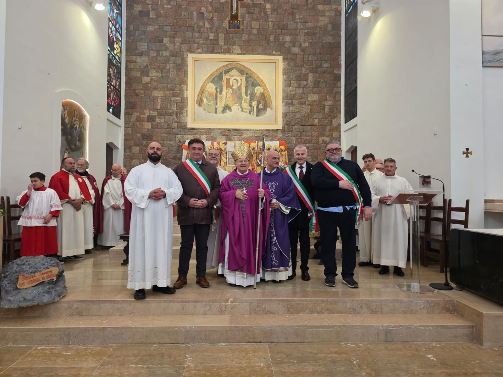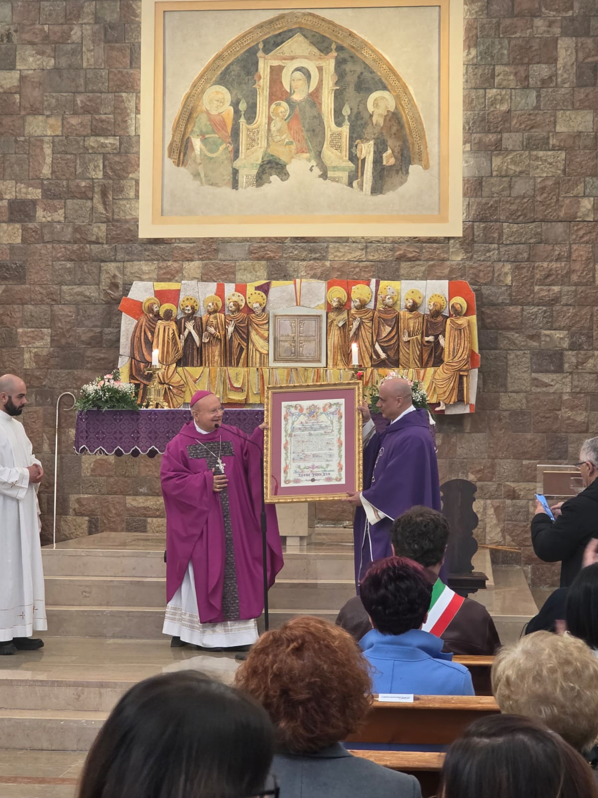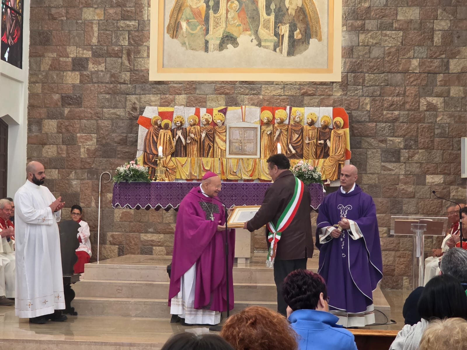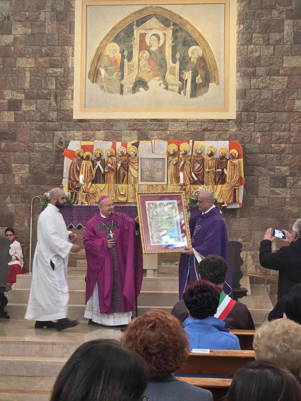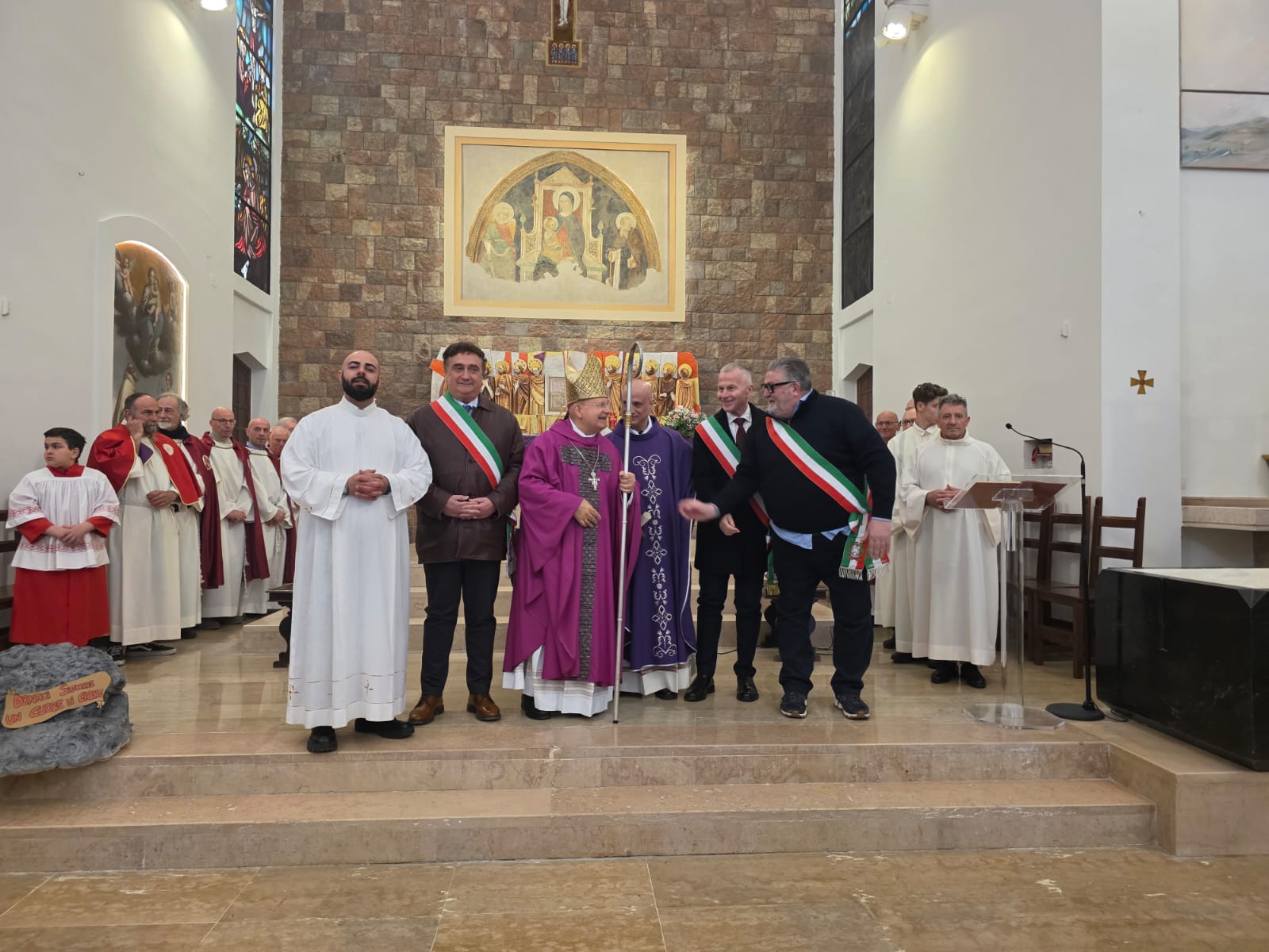 VALFABBRICA – Domenica 22 marzo la comunità parrocchiale e la città di Valfabbrica hanno salutato e reso omaggio a monsignor Domenico Sorrentino per gli anni di episcopato vissuti insieme. Nella chiesa di Santa Maria Assunta, dopo la santa messa presieduta da monsignor Sorrentino, concelebrata dal parroco don Antonio Borgo, il sindaco Enrico Bacoccoli e l’intera comunità parrocchiale hanno reso omaggio al Pastore con alcuni doni in segno di gratitudine e riconoscimento.