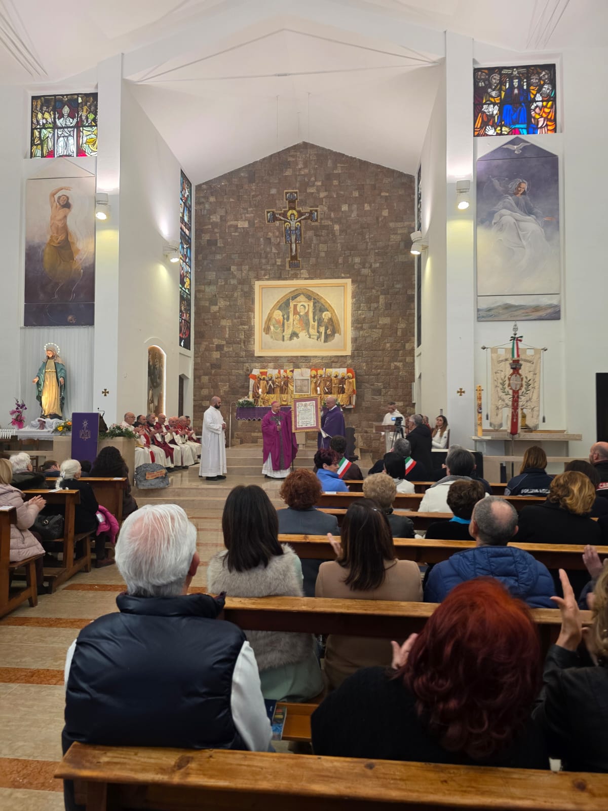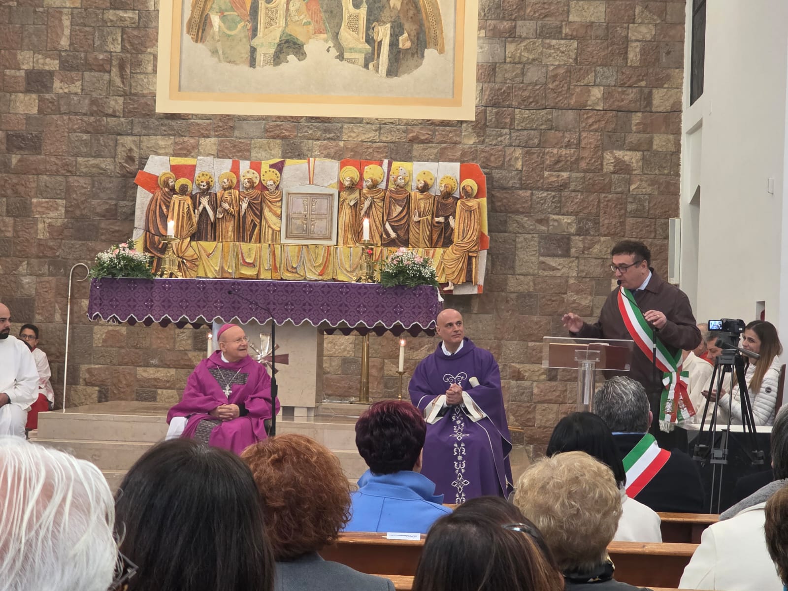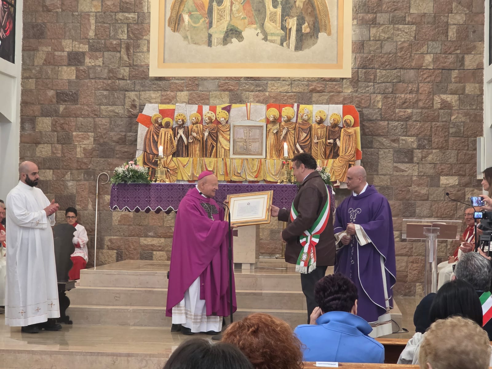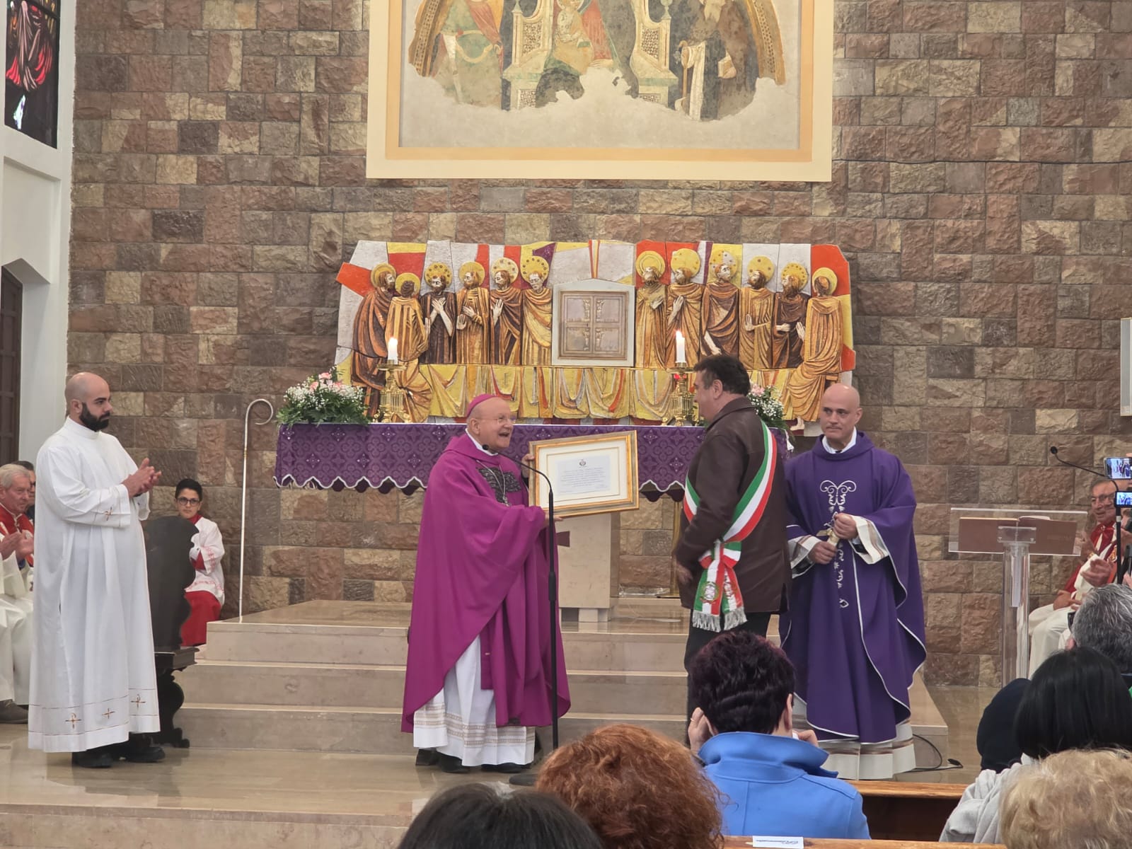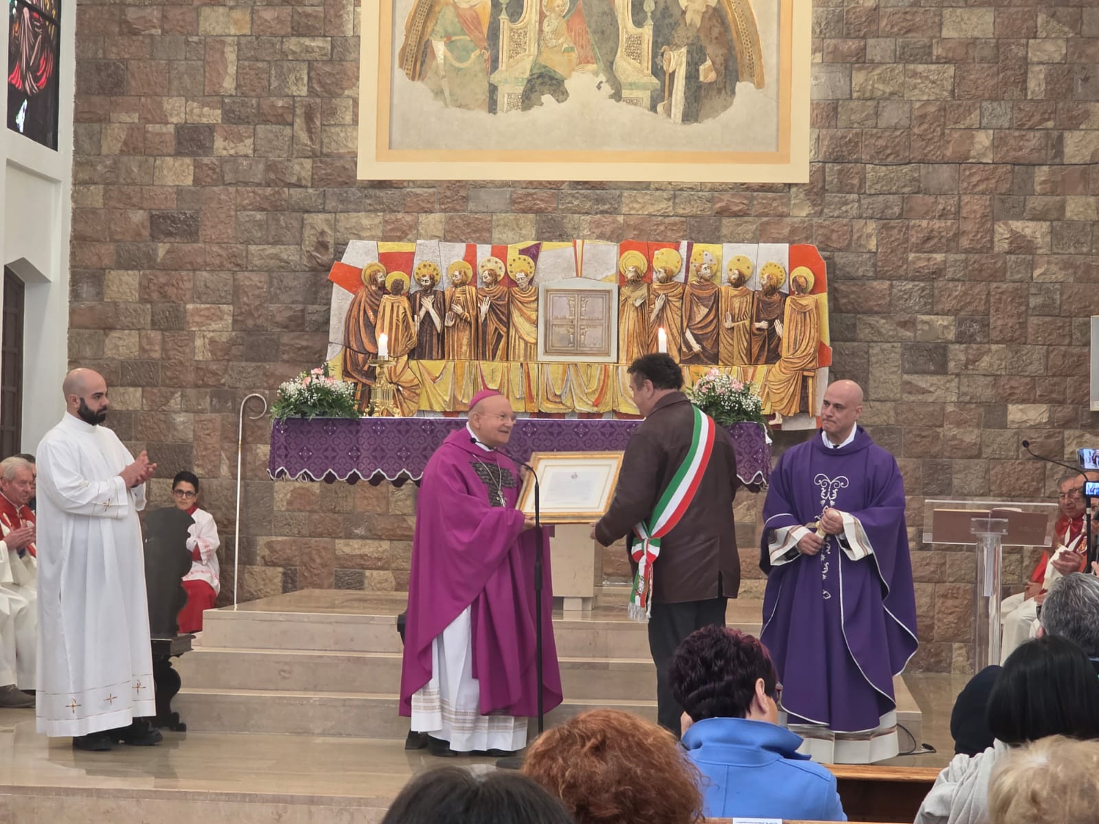 VALFABBRICA – Domenica 22 marzo la comunità parrocchiale e la città di Valfabbrica hanno salutato e reso omaggio a monsignor Domenico Sorrentino per gli anni di episcopato vissuti insieme. Nella chiesa di Santa Maria Assunta, dopo la santa messa presieduta da monsignor Sorrentino, concelebrata dal parroco don Antonio Borgo, il sindaco Enrico Bacoccoli e l’intera comunità parrocchiale hanno reso omaggio al Pastore con alcuni doni in segno di gratitudine e riconoscimento.