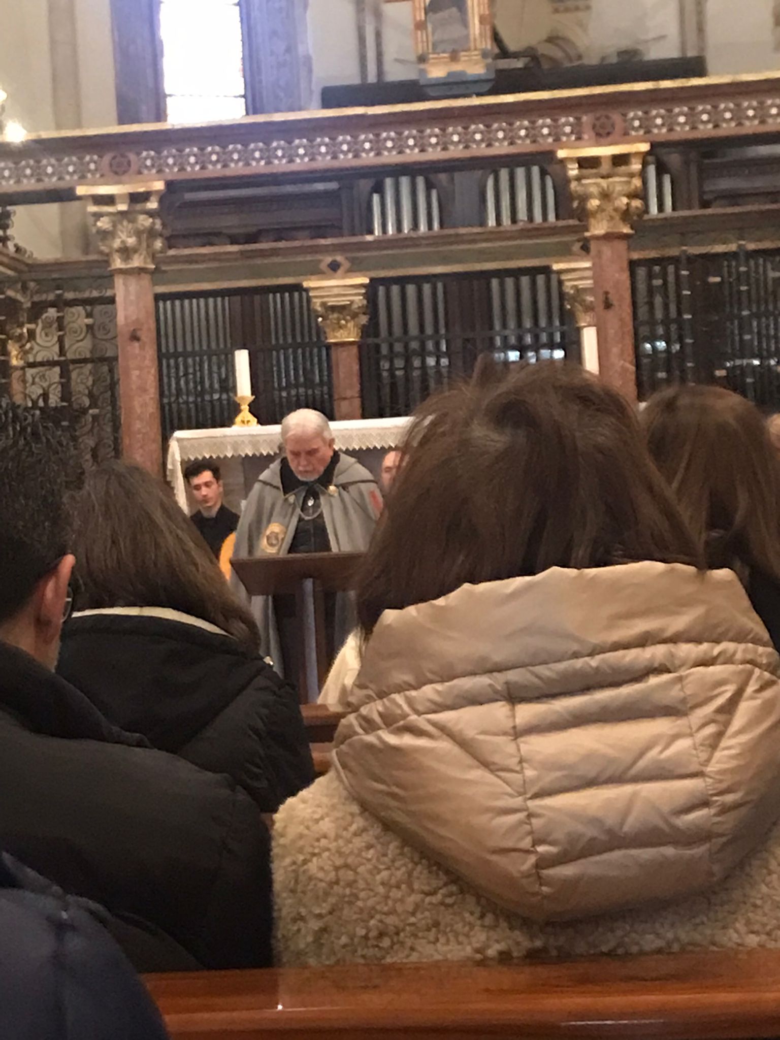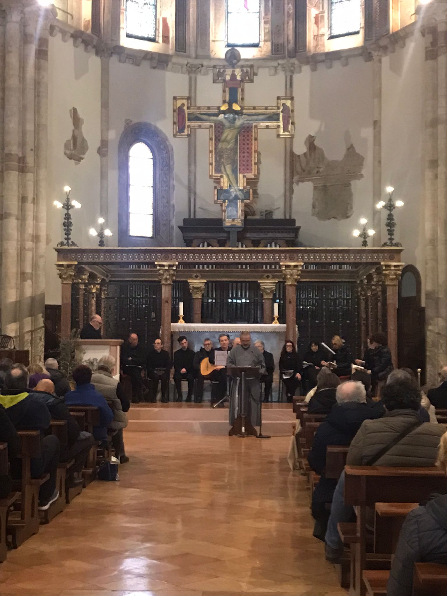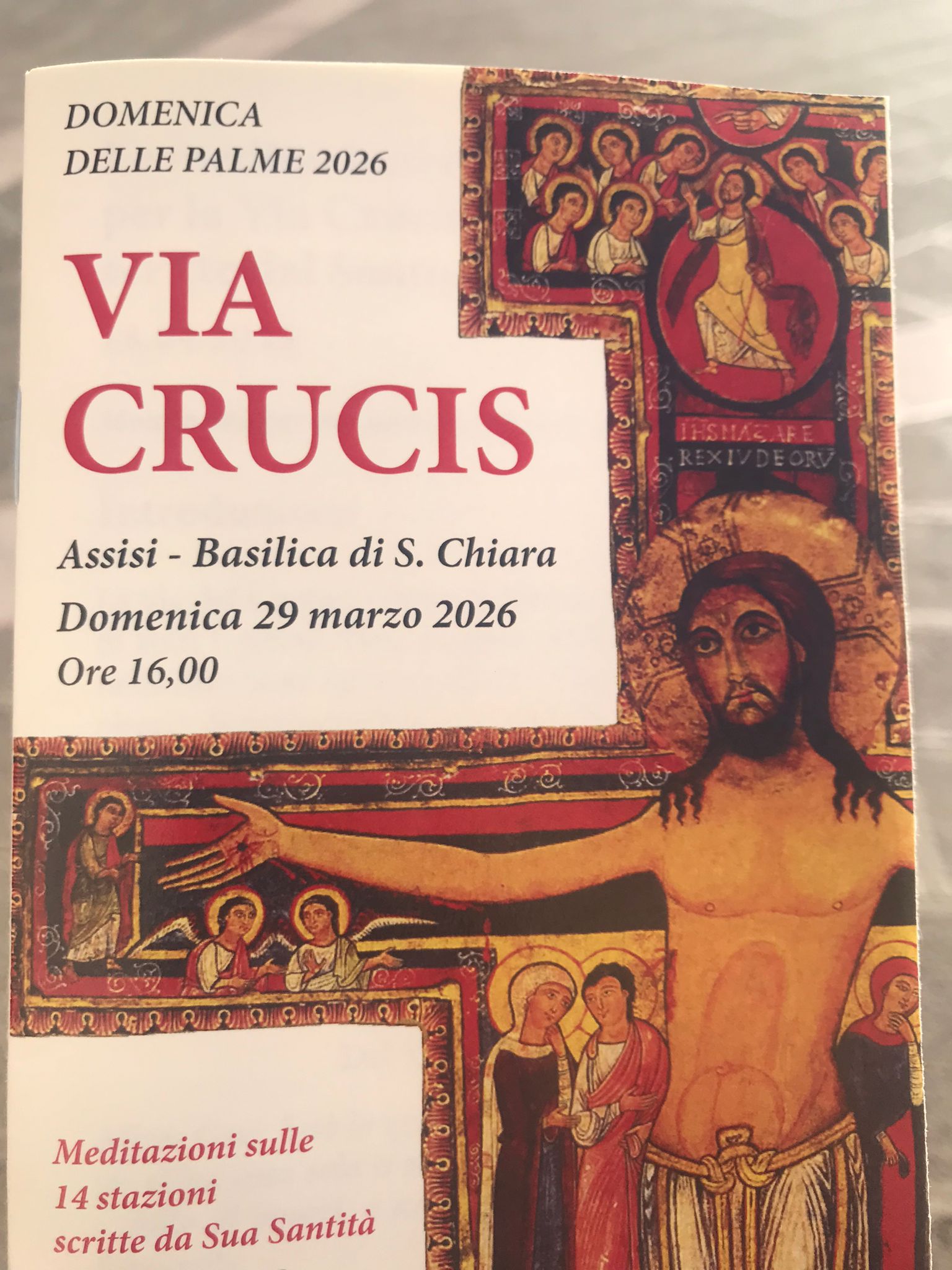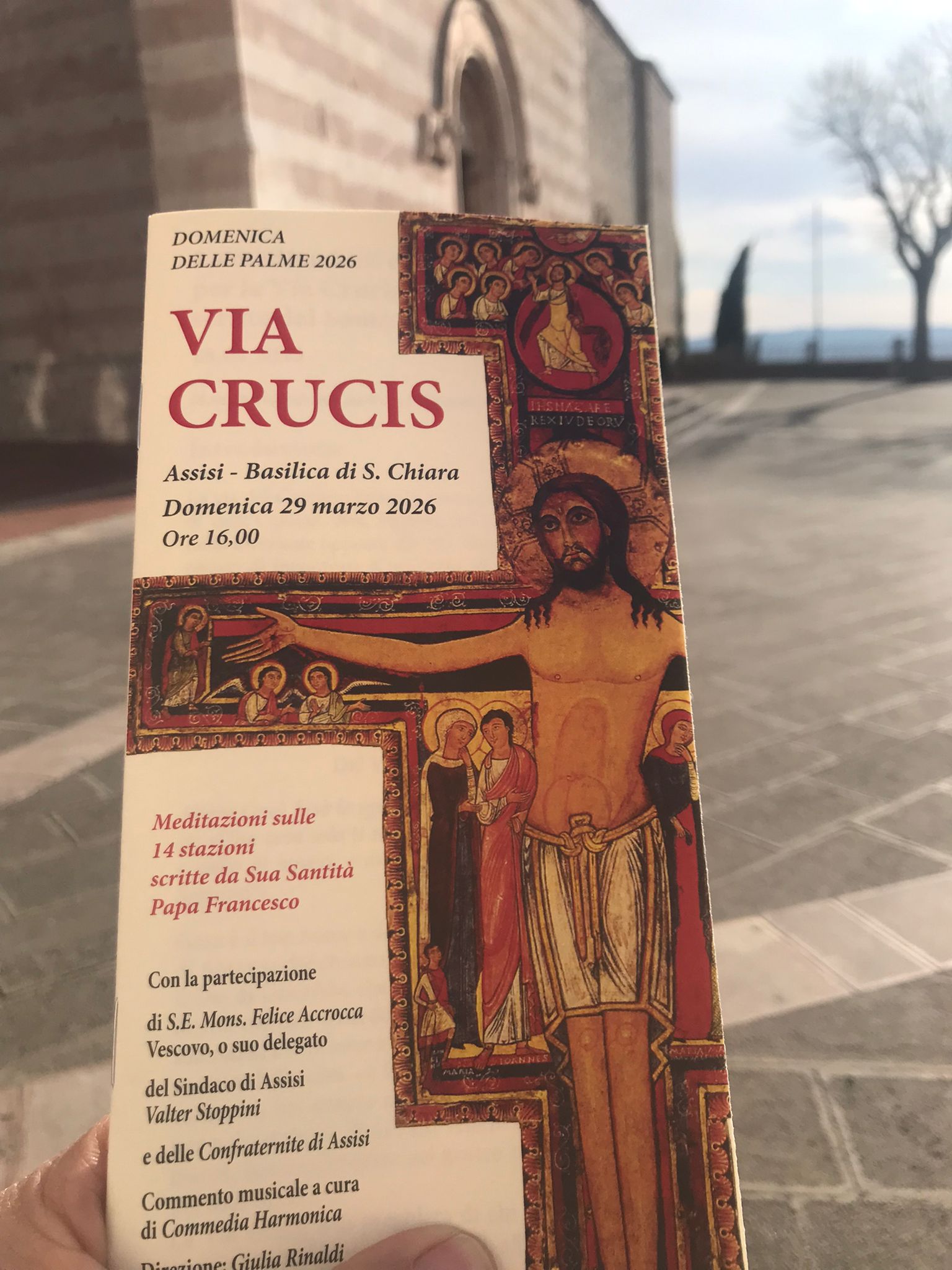 ASSISI – Il nuovo vescovo monsignor Felice Accrocca nel pomeriggio della Domenica delle Palme ha partecipato alla Via Crucis tenuta nella Basilica di Santa Chiara dall'insieme vocale Commedia Harmonica. Il tradizionale appuntamento della Settimana Santa ha visto una profonda meditazione, accompagnata da canti sacri, sulle stazioni scritte da Sua Santità.